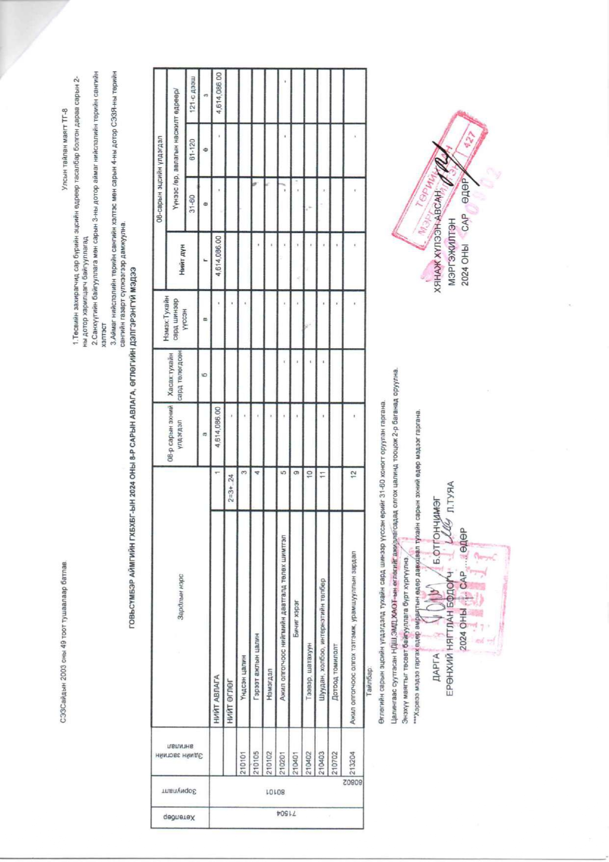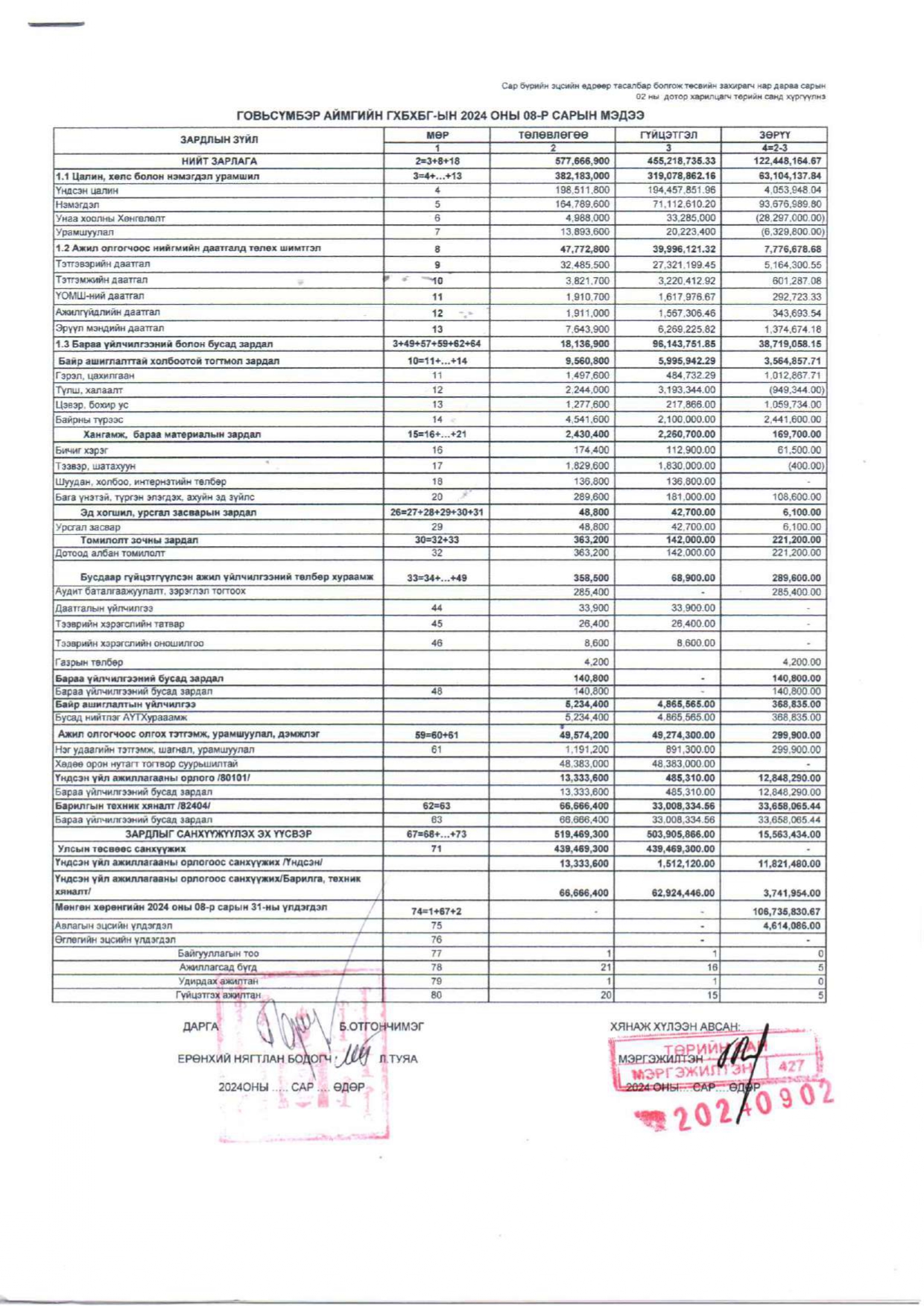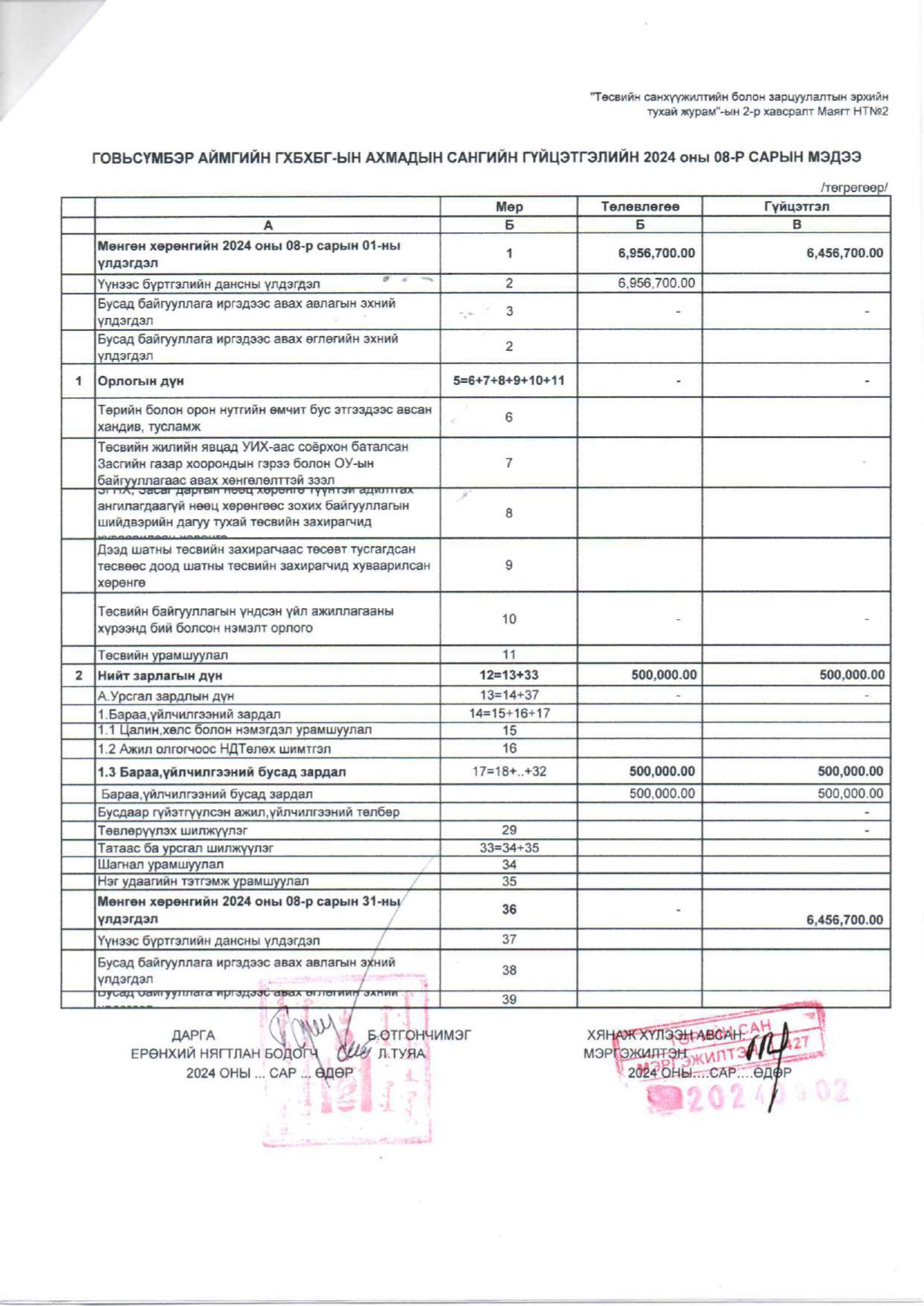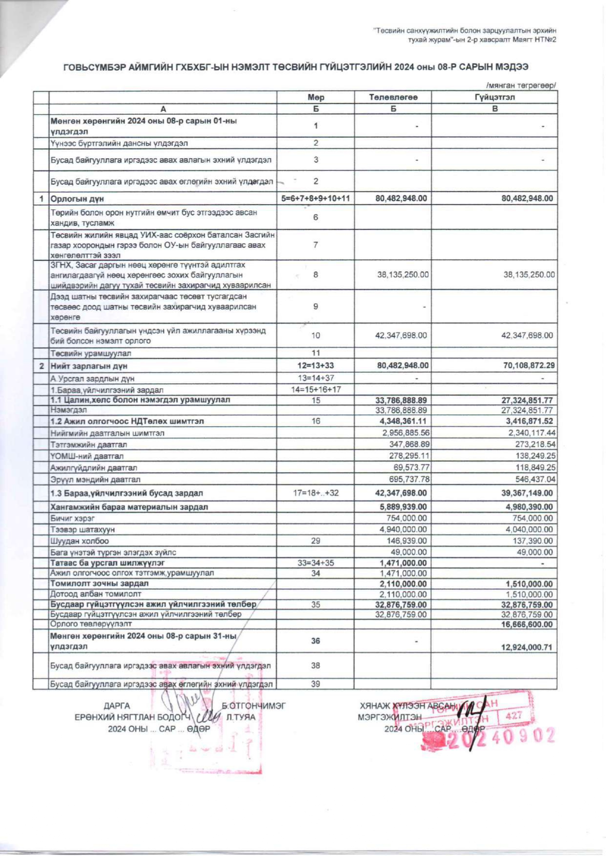 ТӨСВИЙН ГҮЙЦЭТГЭЛИЙН МЭДЭЭ 8 сар