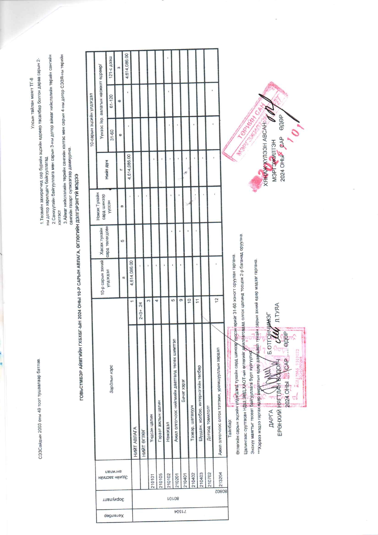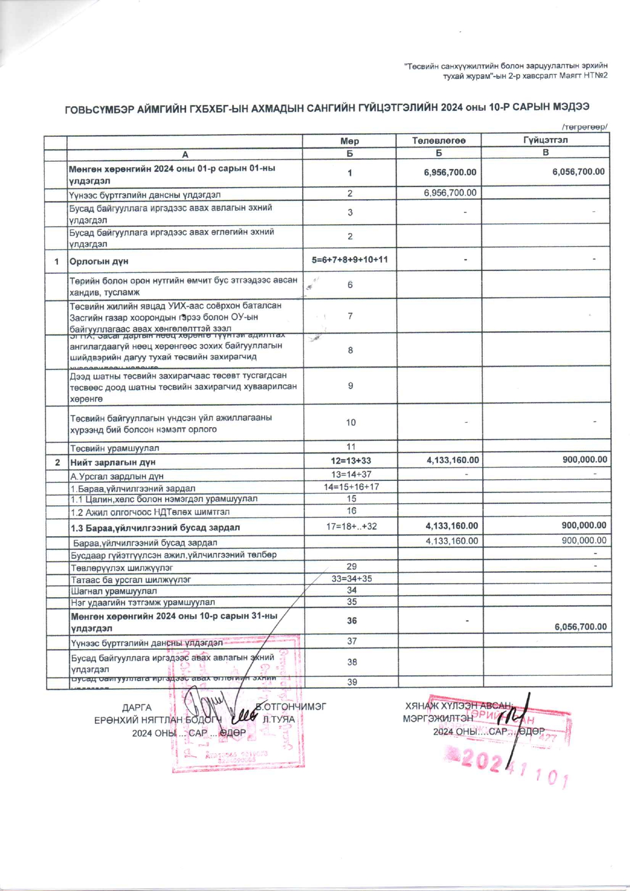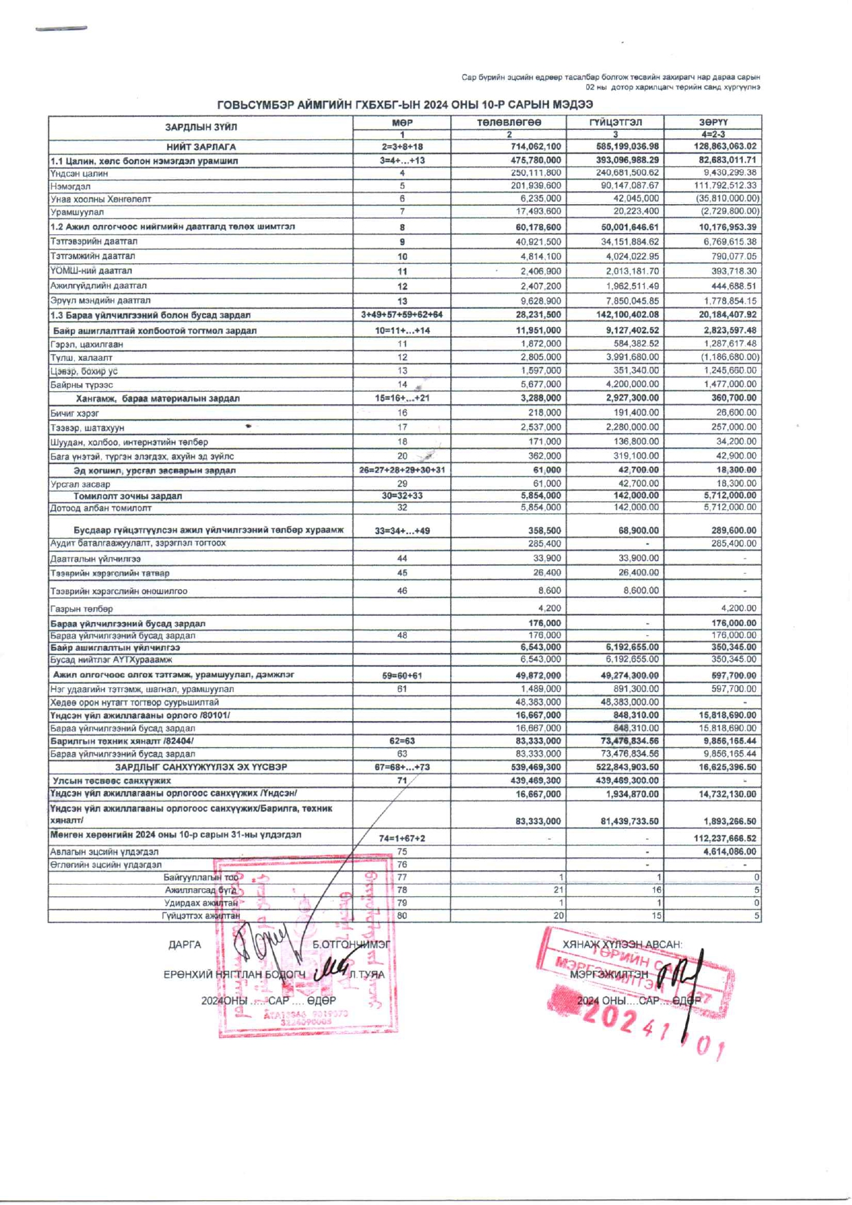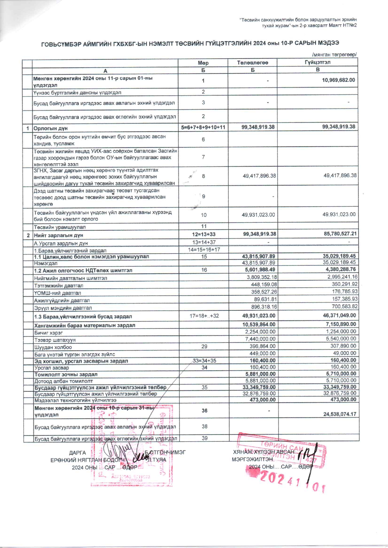 ТӨСВИЙН ГҮЙЦЭТГЭЛИЙН МЭДЭЭ 10 сар