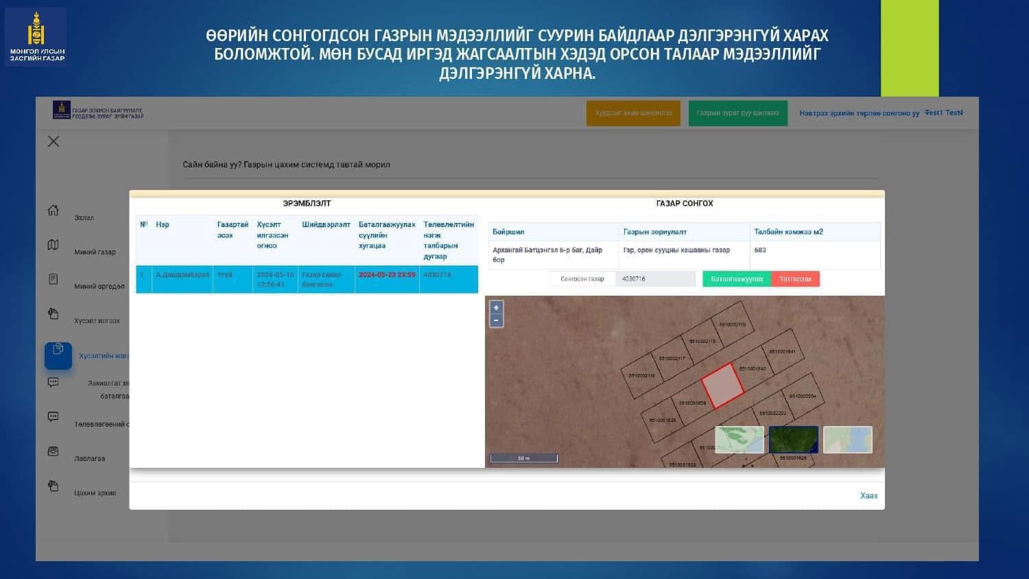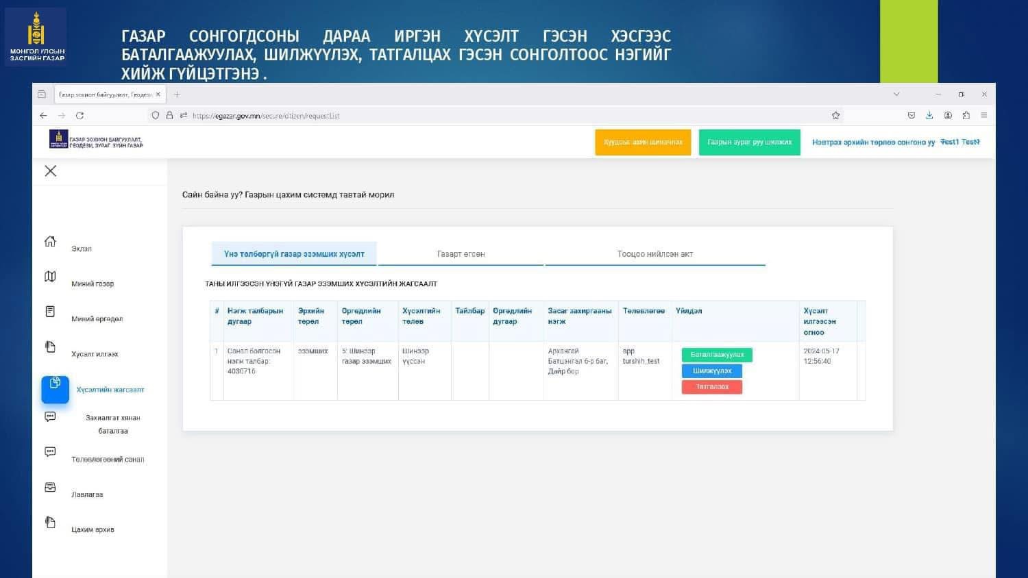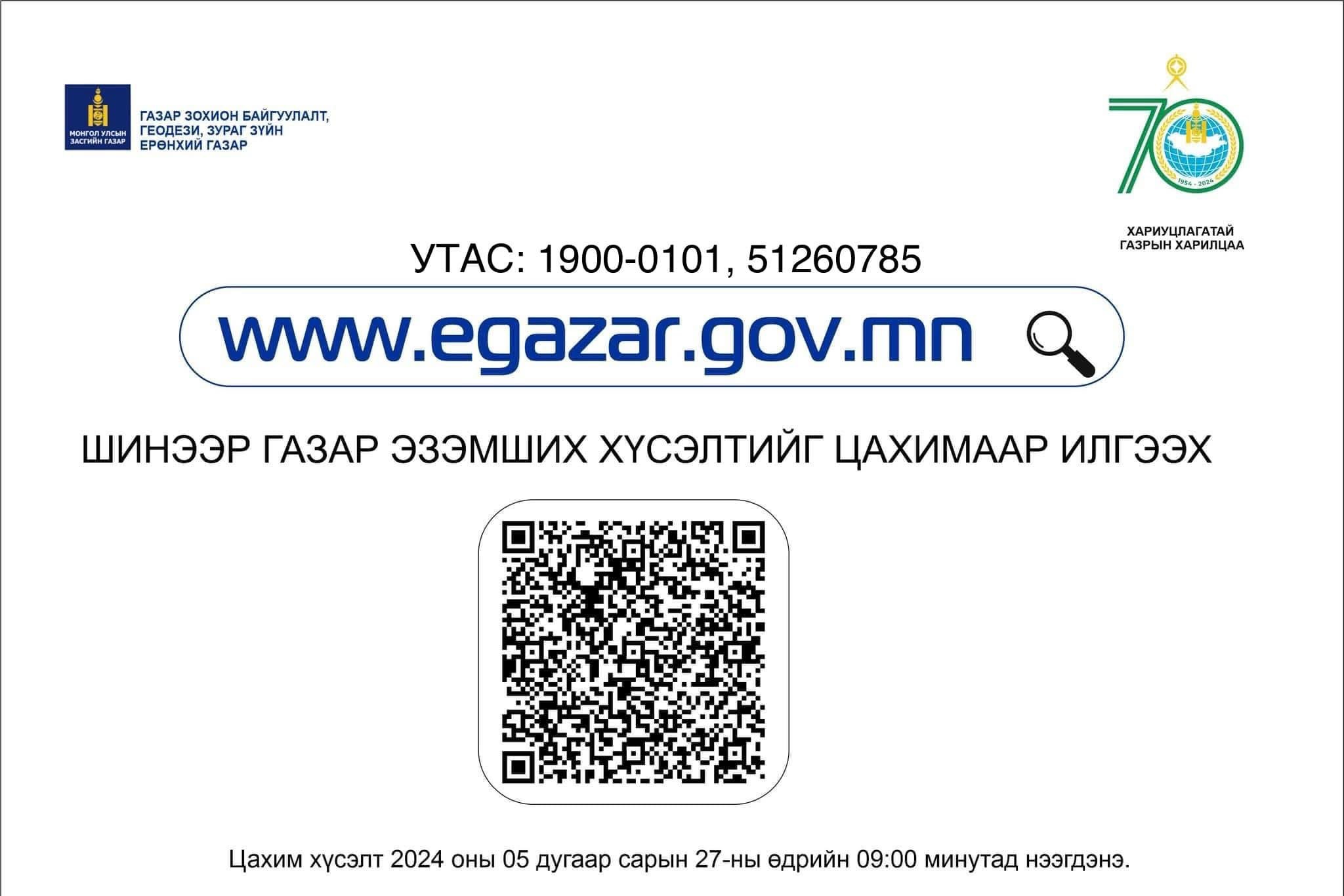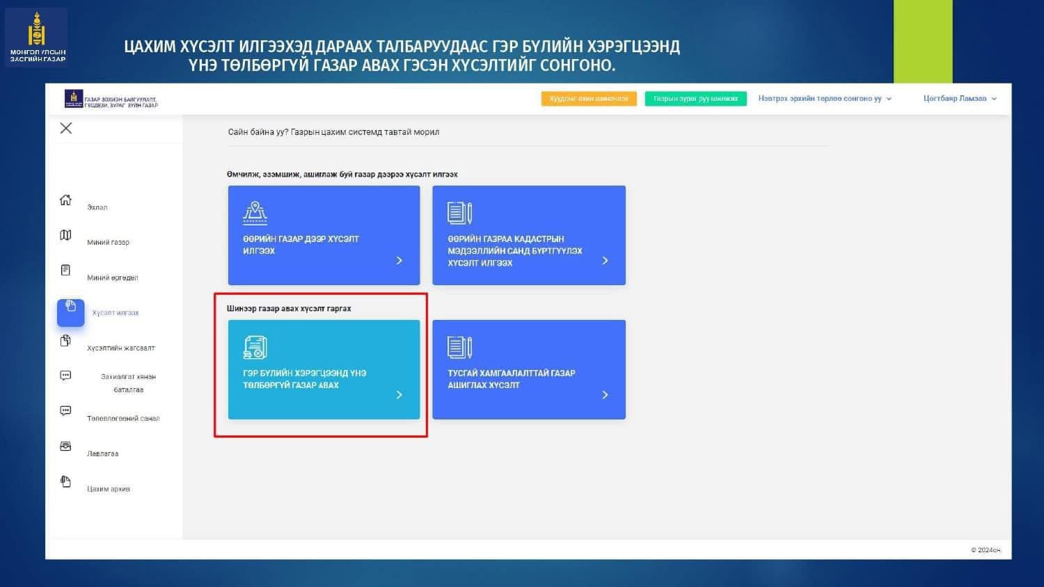 Шинээр газар эзэмших хүсэлтийг www.egazar.gov.mn цахим системээр илгээх заавар