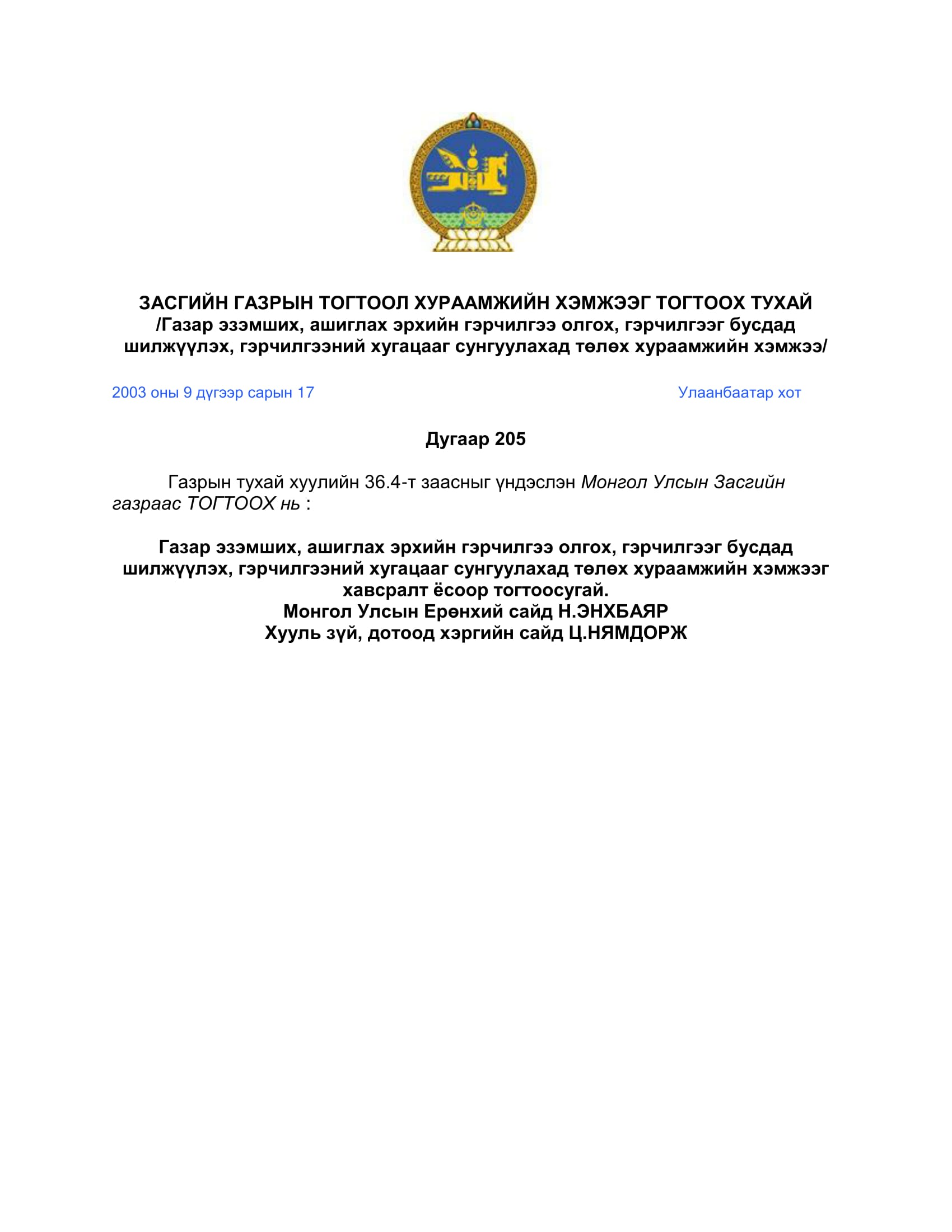 2003 оны 205 дугаар тогтоол газар эзэмших, ашиглах эрхийн гэрчилгээ олгох, бусдад шилжүүлэх, гэрчилгээний хугацааг сунгахад төлөх хураамжийн хэмжээ
