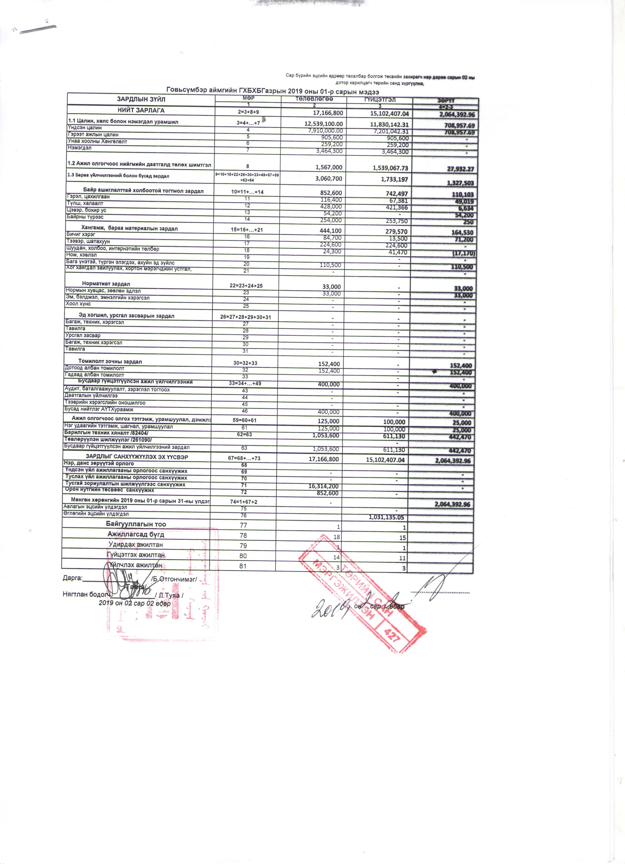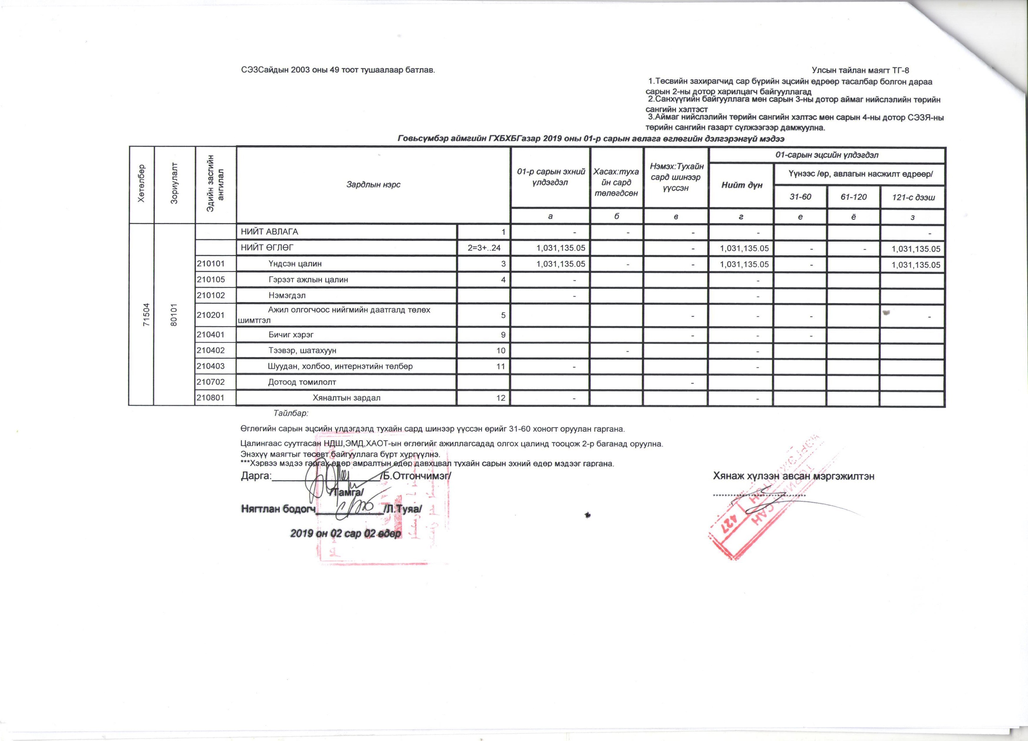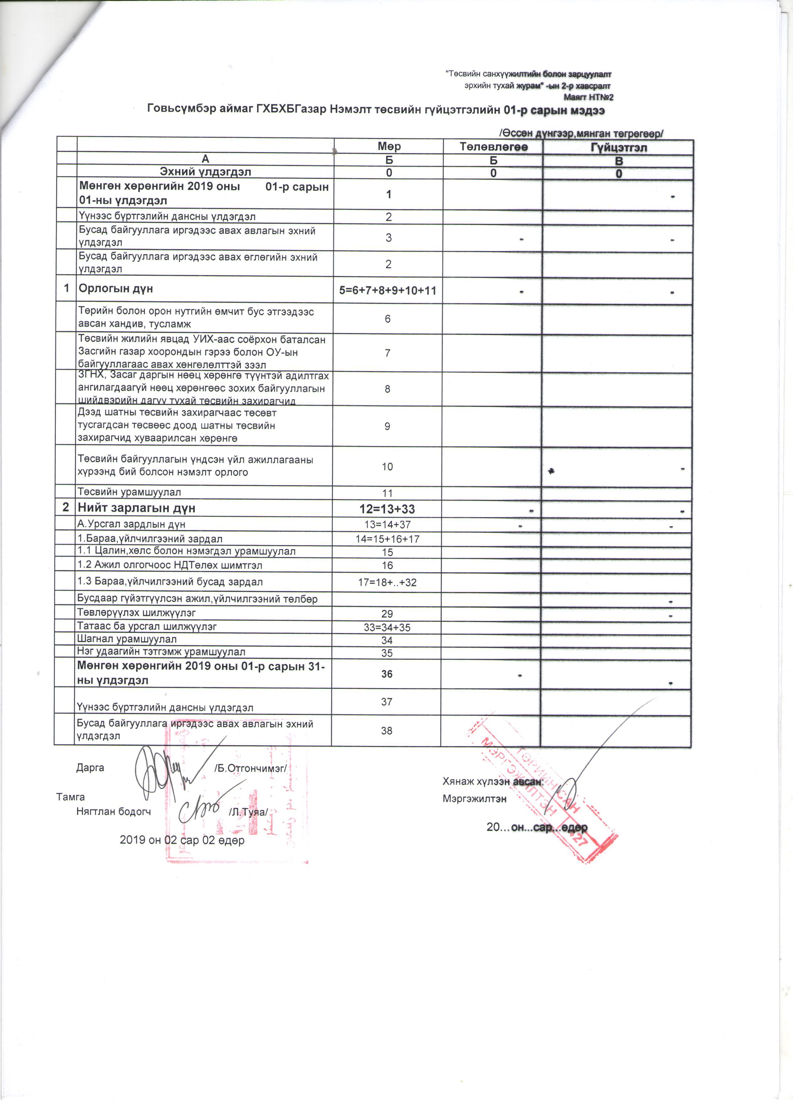 2019 Төсвийн гүйцэтгэлийн 1 дүгээр сарын мэдээ