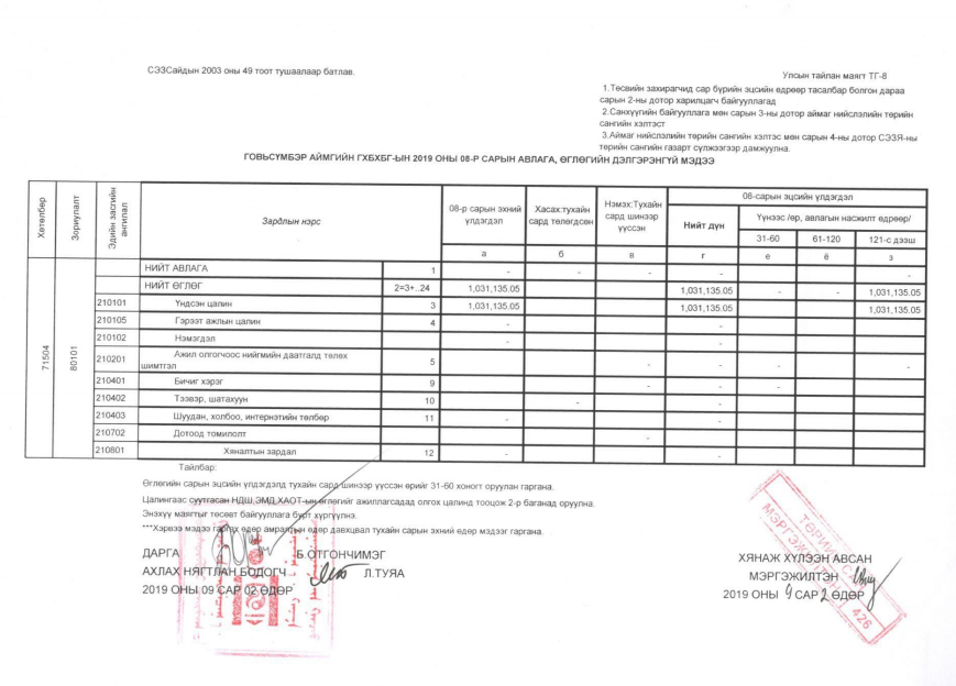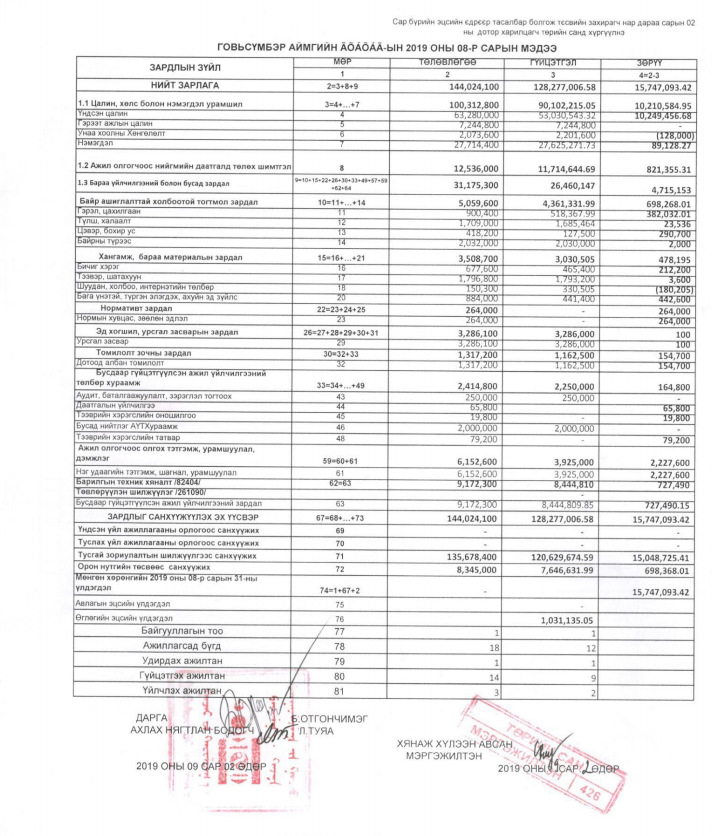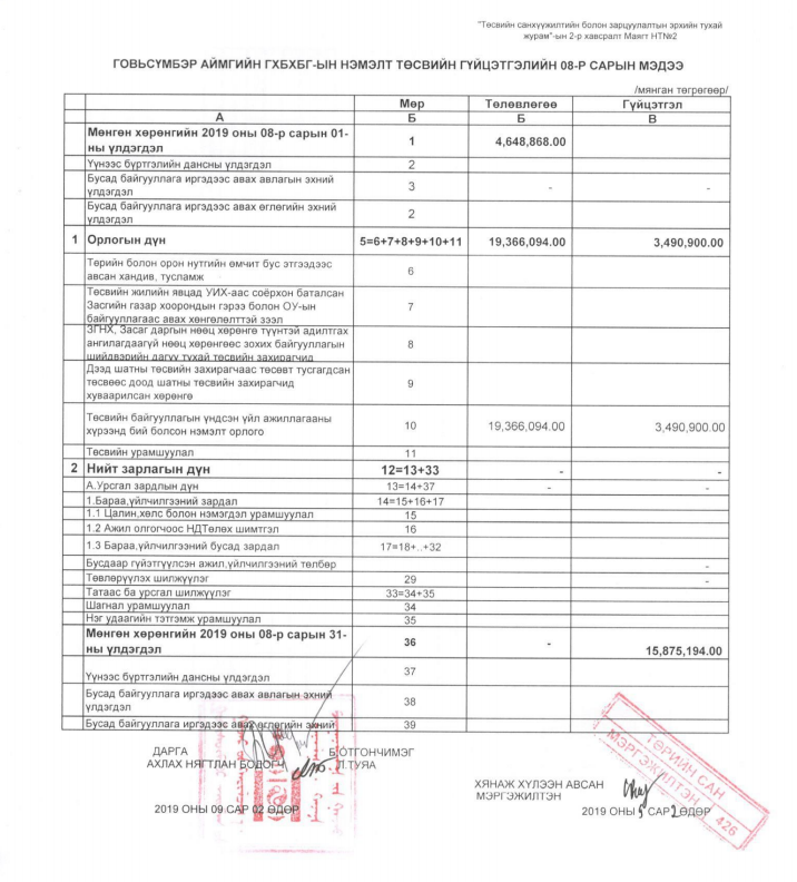 2019 ОНЫ ТӨСВИЙН ГҮЙЦЭТГЭЛИЙН 8 ДУГААР САРЫН МЭДЭЭ