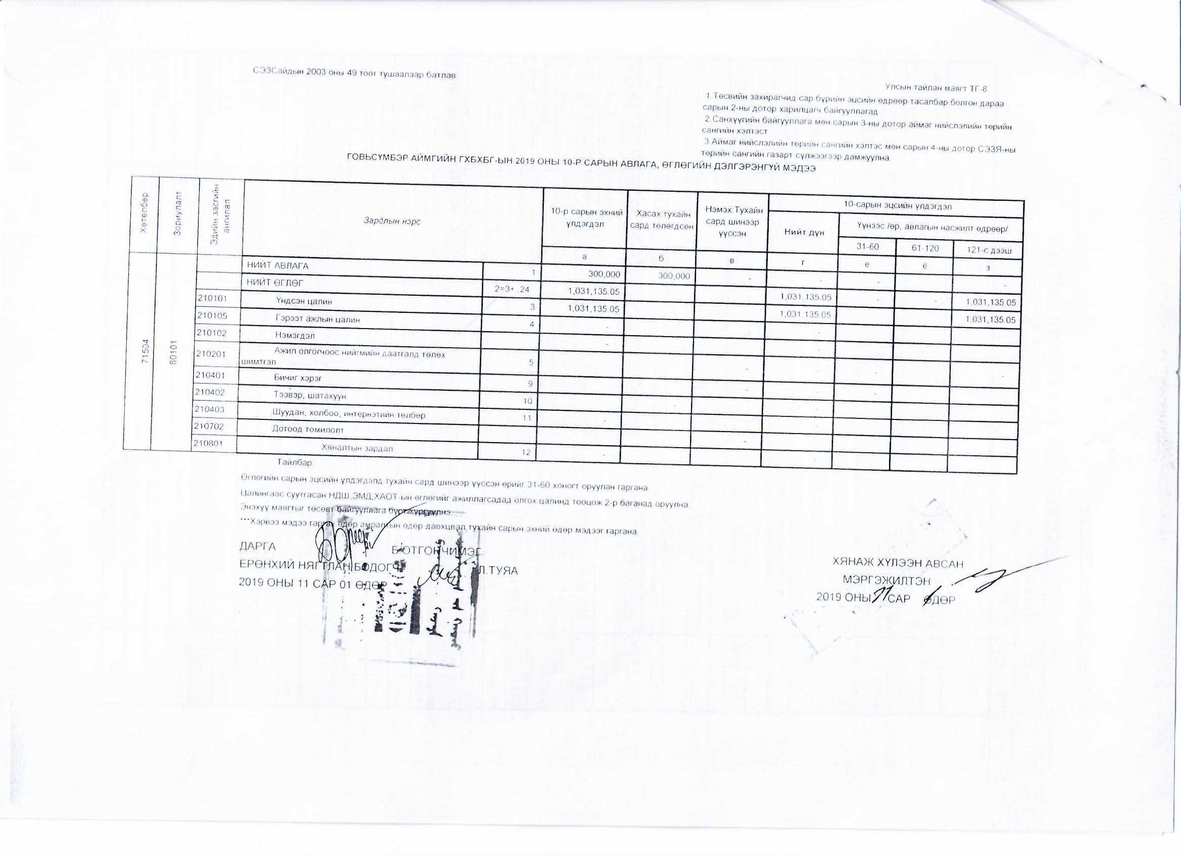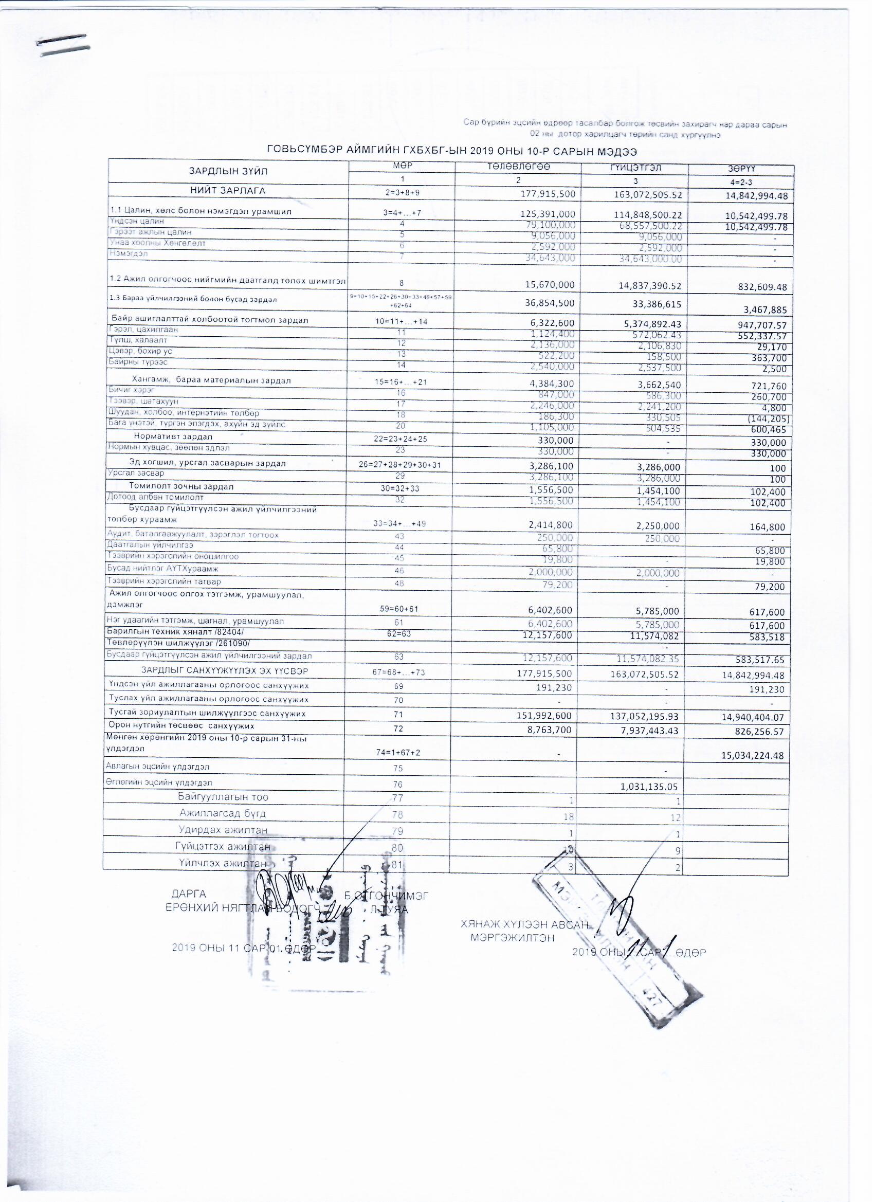 2019 ОНЫ ТӨСВИЙН ГҮЙЦЭТГЭЛИЙН 10 ДУГААР САРЫН МЭДЭЭ