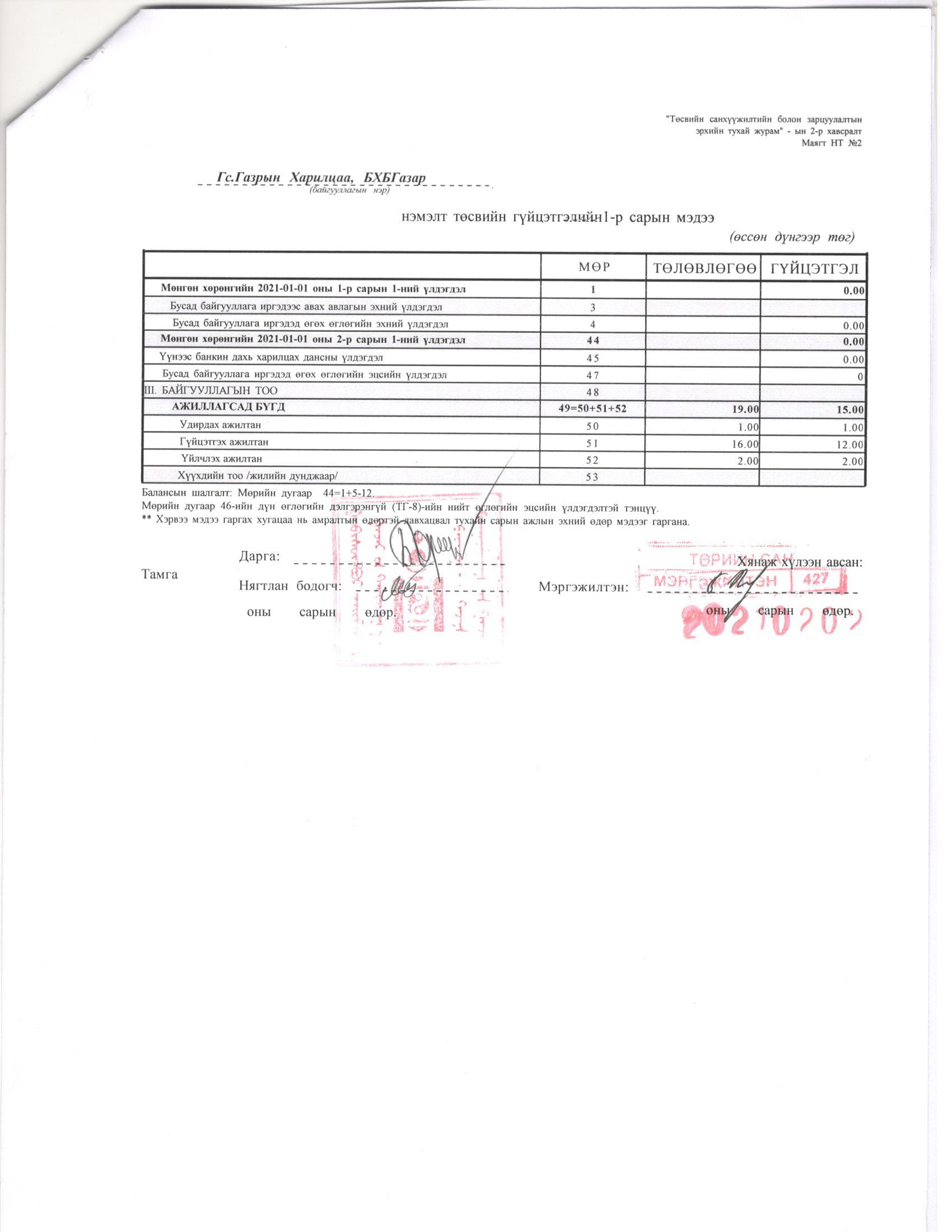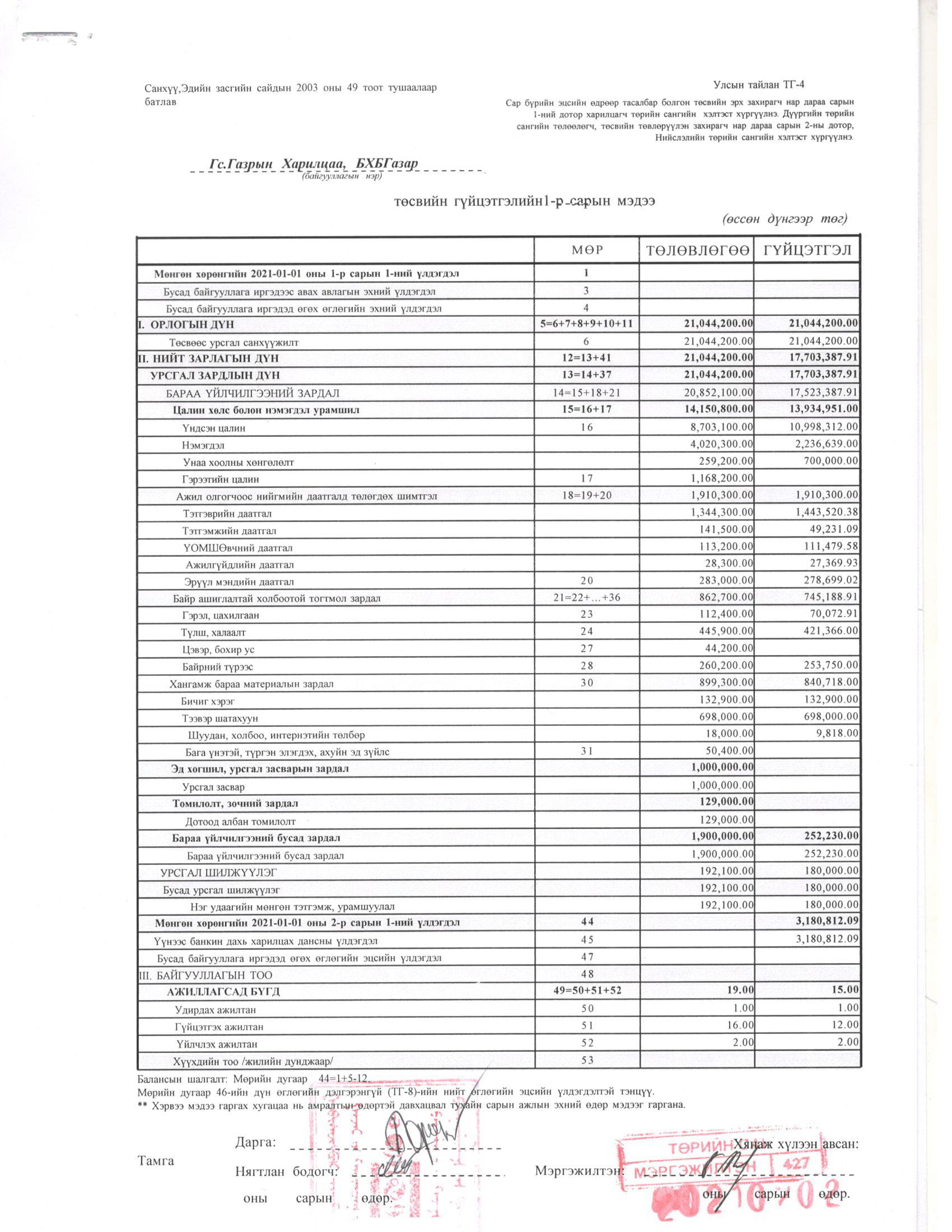 ТӨСВИЙН ГҮЙЦЭТГЭЛИЙН БИЕЛЭЛТ БОЛОН ХАГАС БҮТЭН ЖИЛИЙН САНХҮҮГИЙН ТАЙЛАН