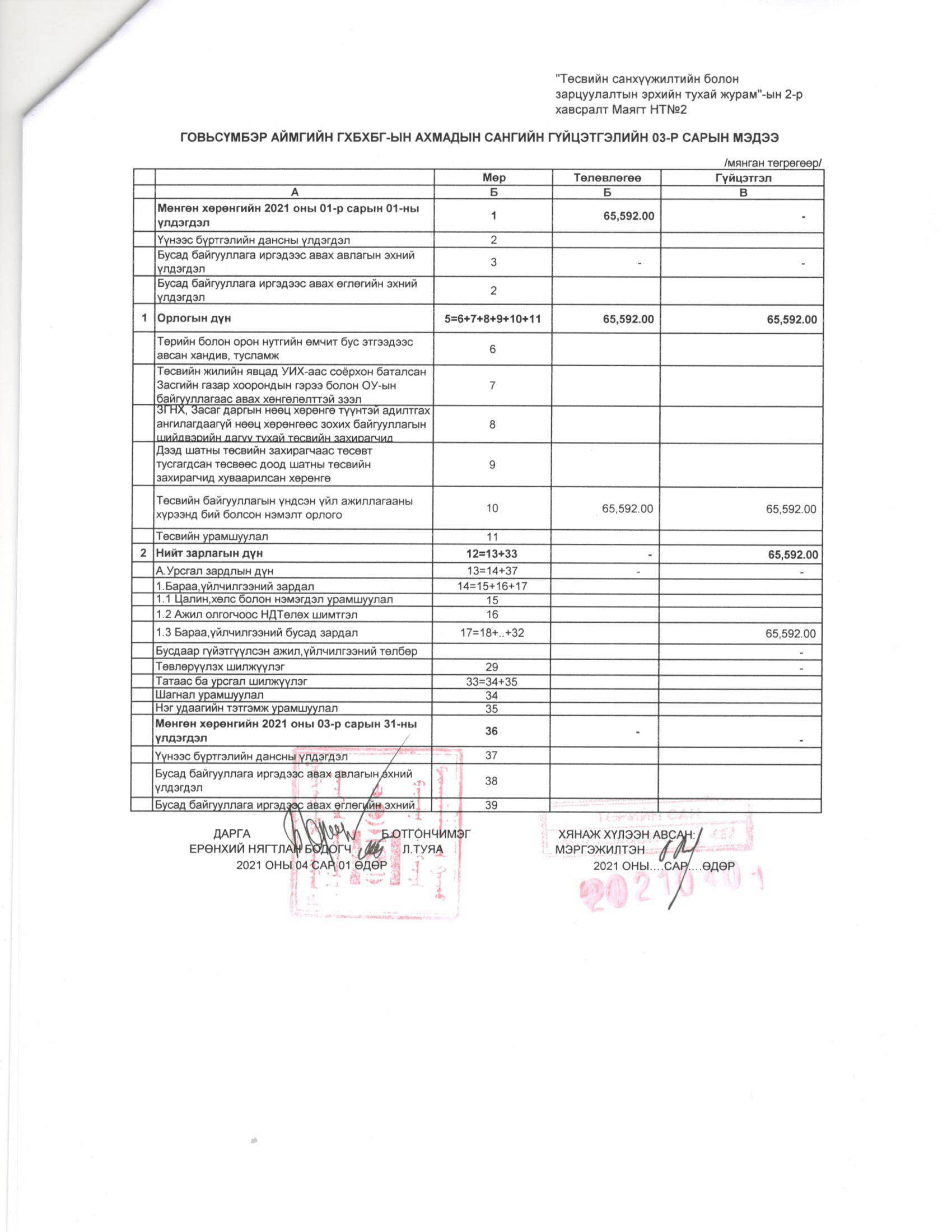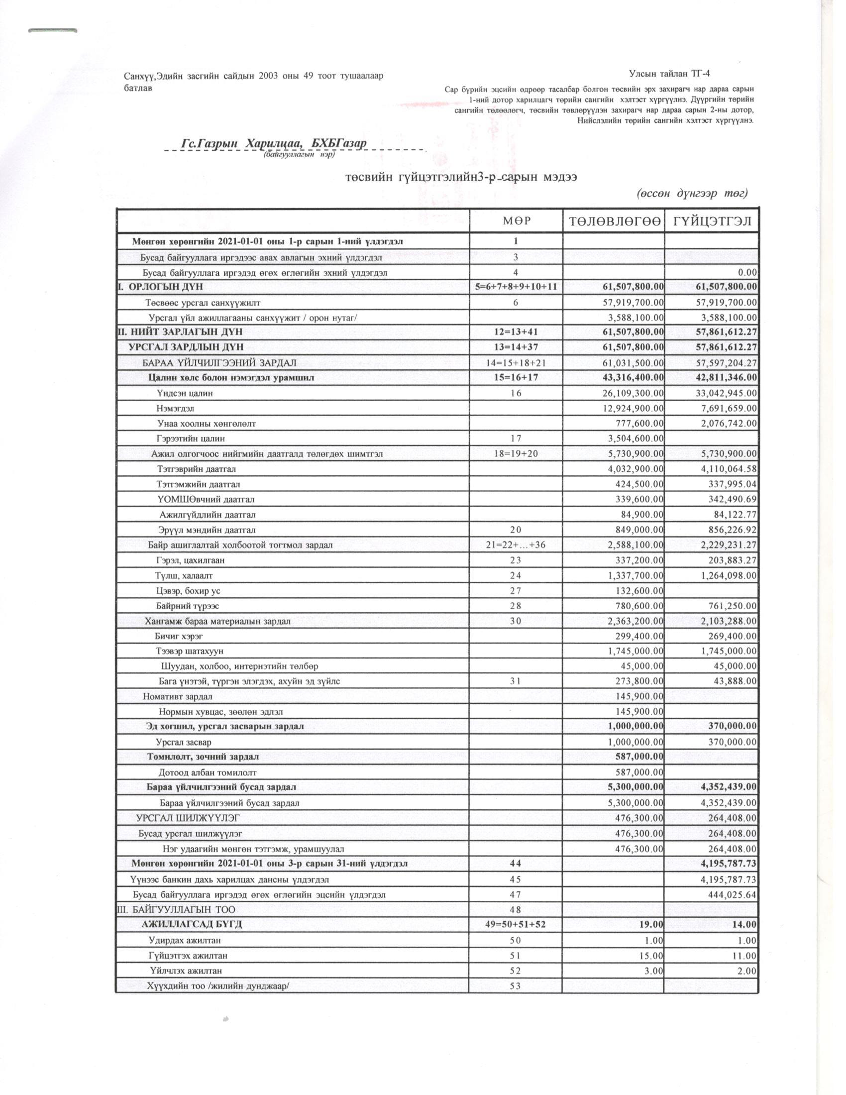 ТӨСВИЙН ГҮЙЦЭТГЭЛИЙН БИЕЛЭЛТ БОЛОН ХАГАС БҮТЭН ЖИЛИЙН САНХҮҮГИЙН ТАЙЛАН