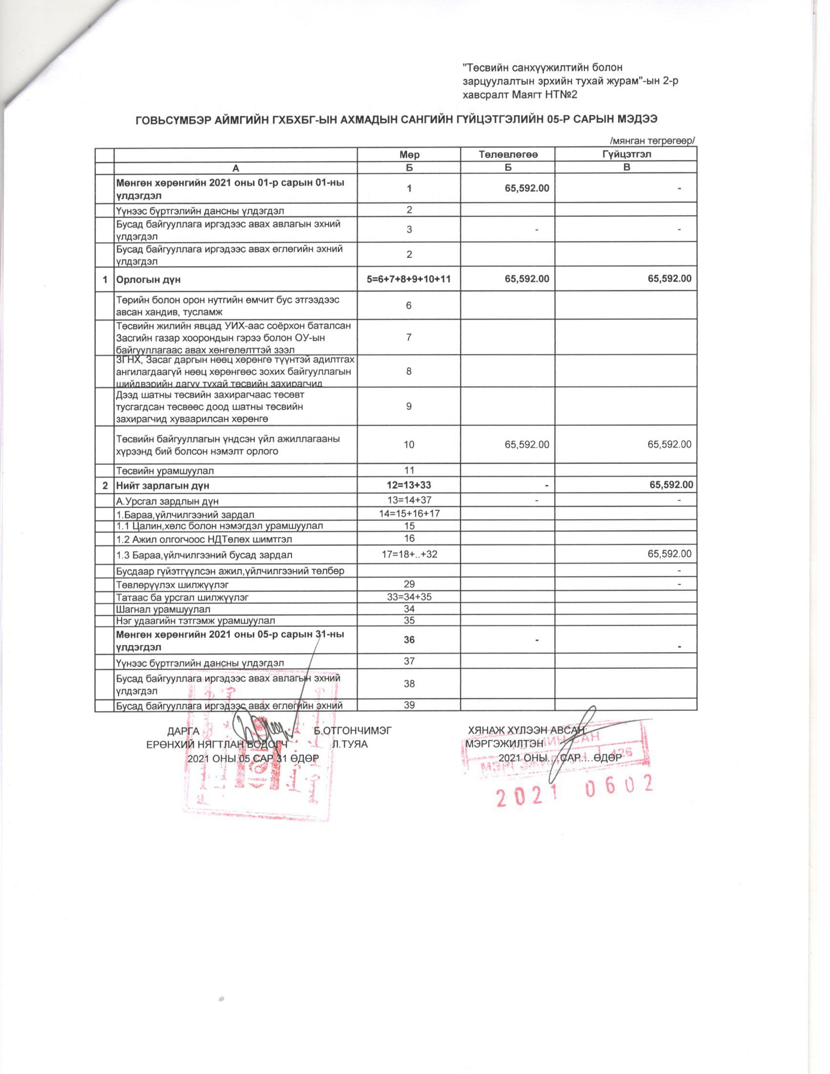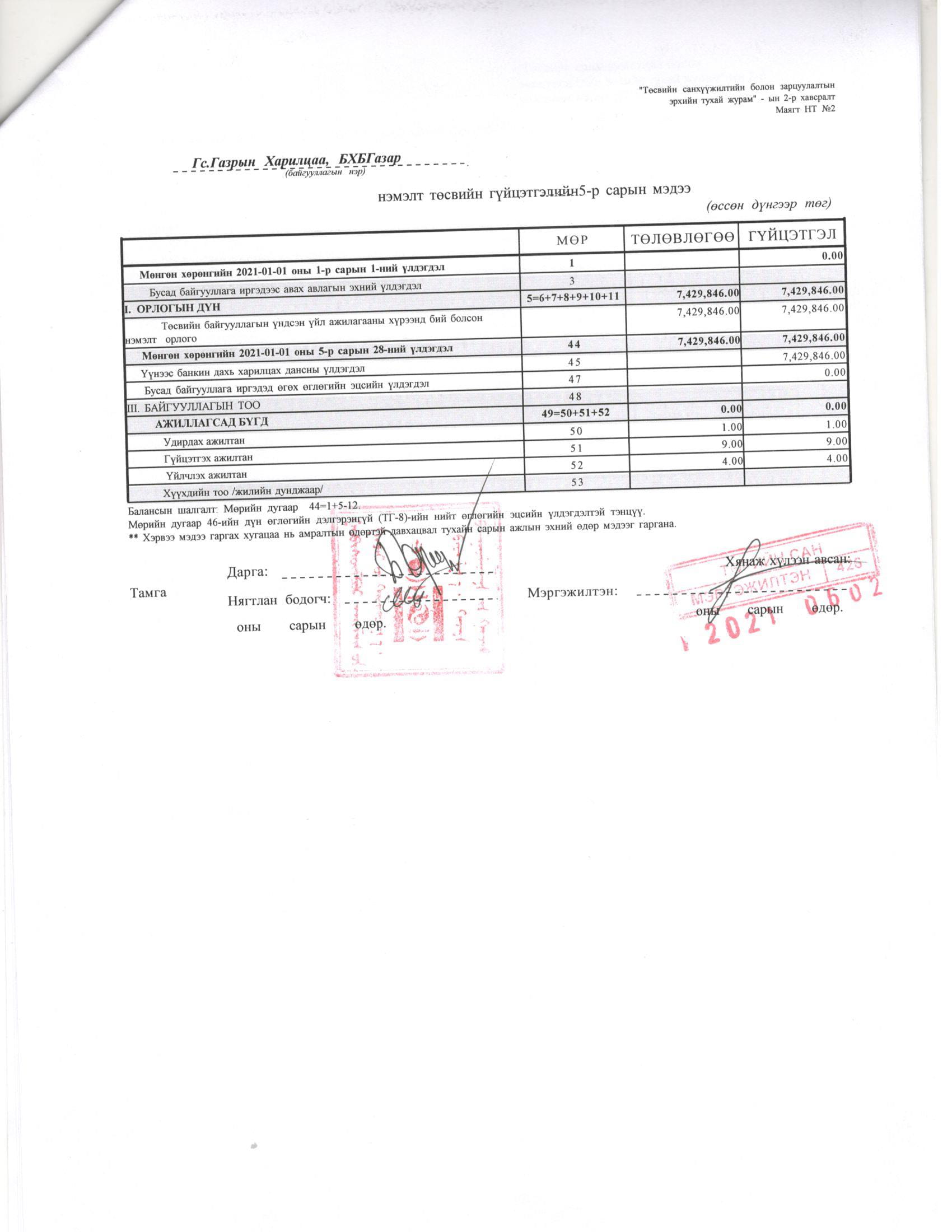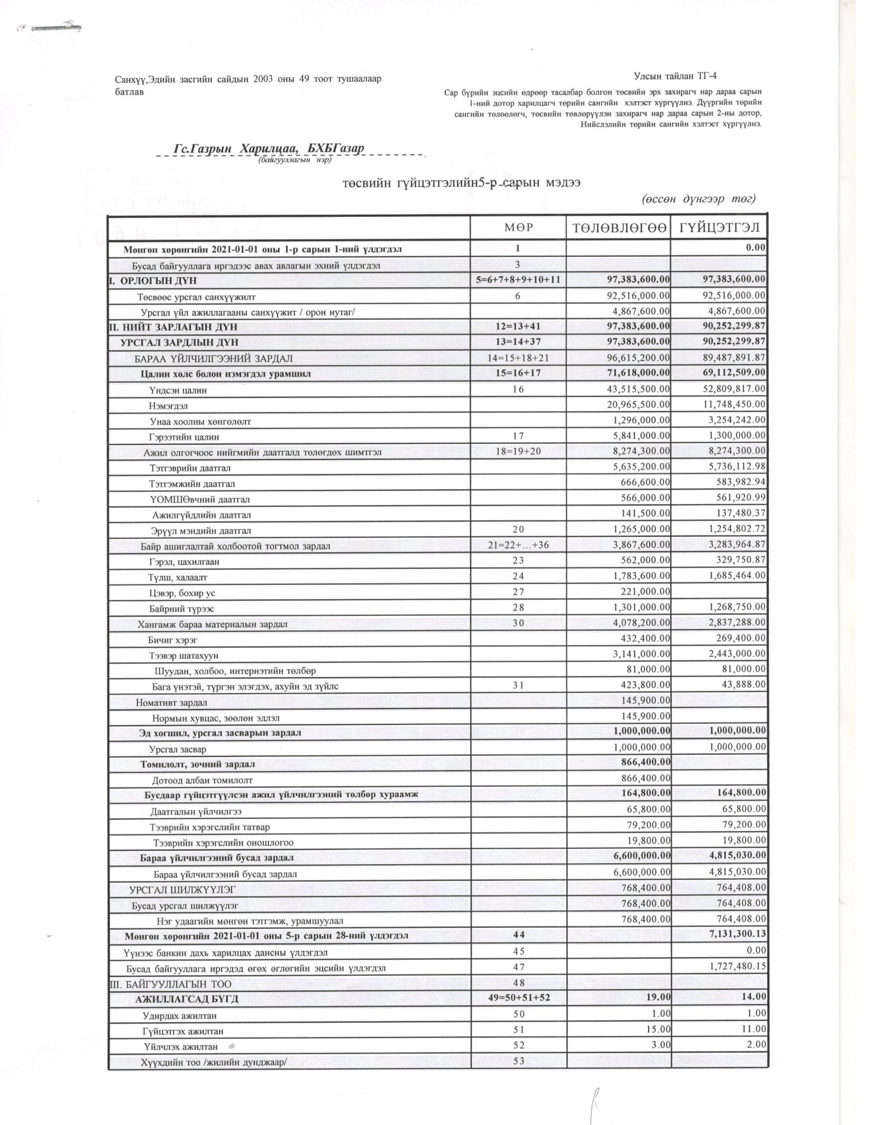 ТӨСВИЙН ГҮЙЦЭТГЭЛИЙН БИЕЛЭЛТ БОЛОН ХАГАС БҮТЭН ЖИЛИЙН САНХҮҮГИЙН ТАЙЛАН