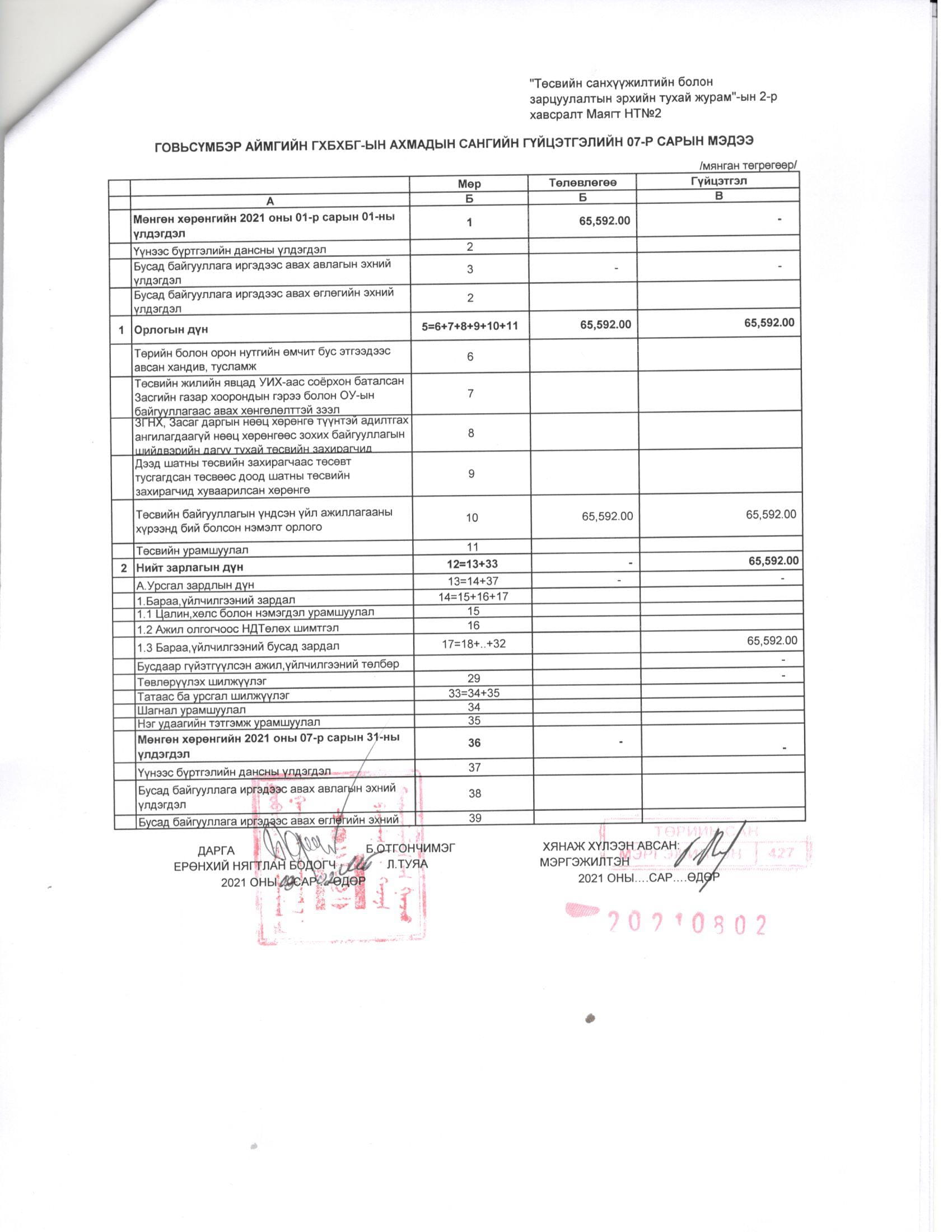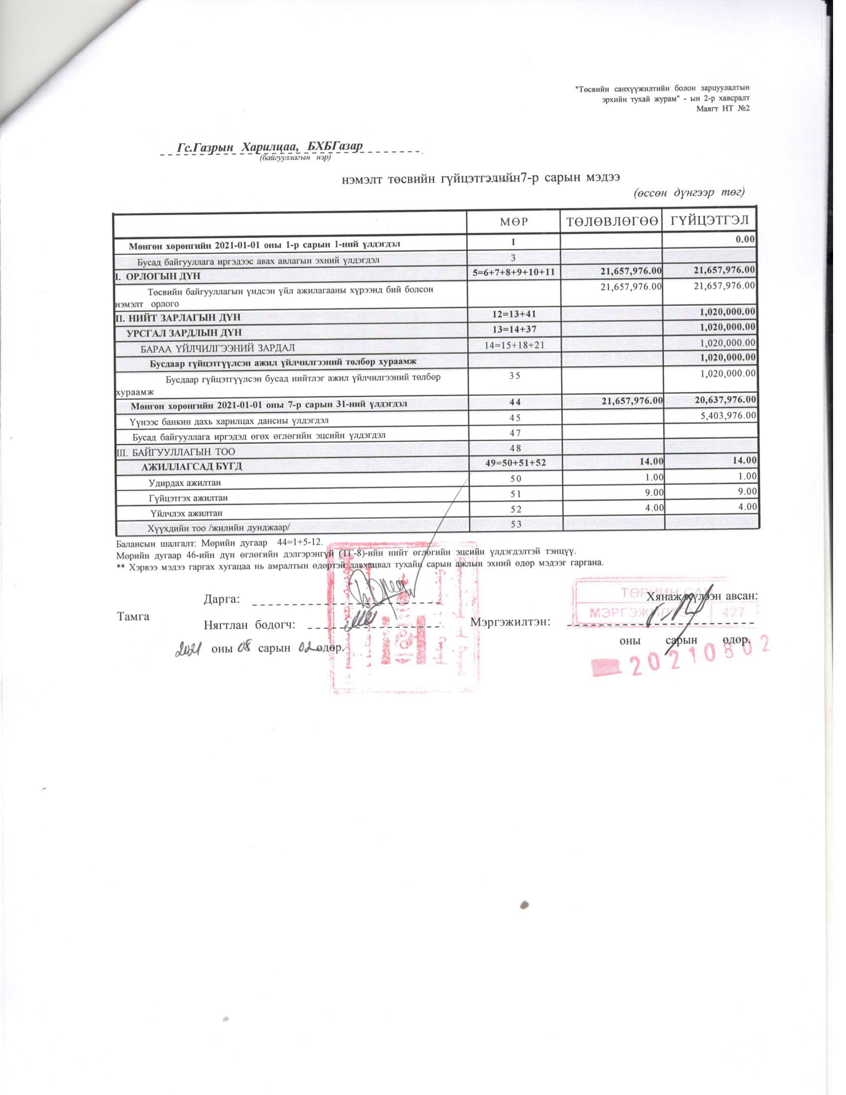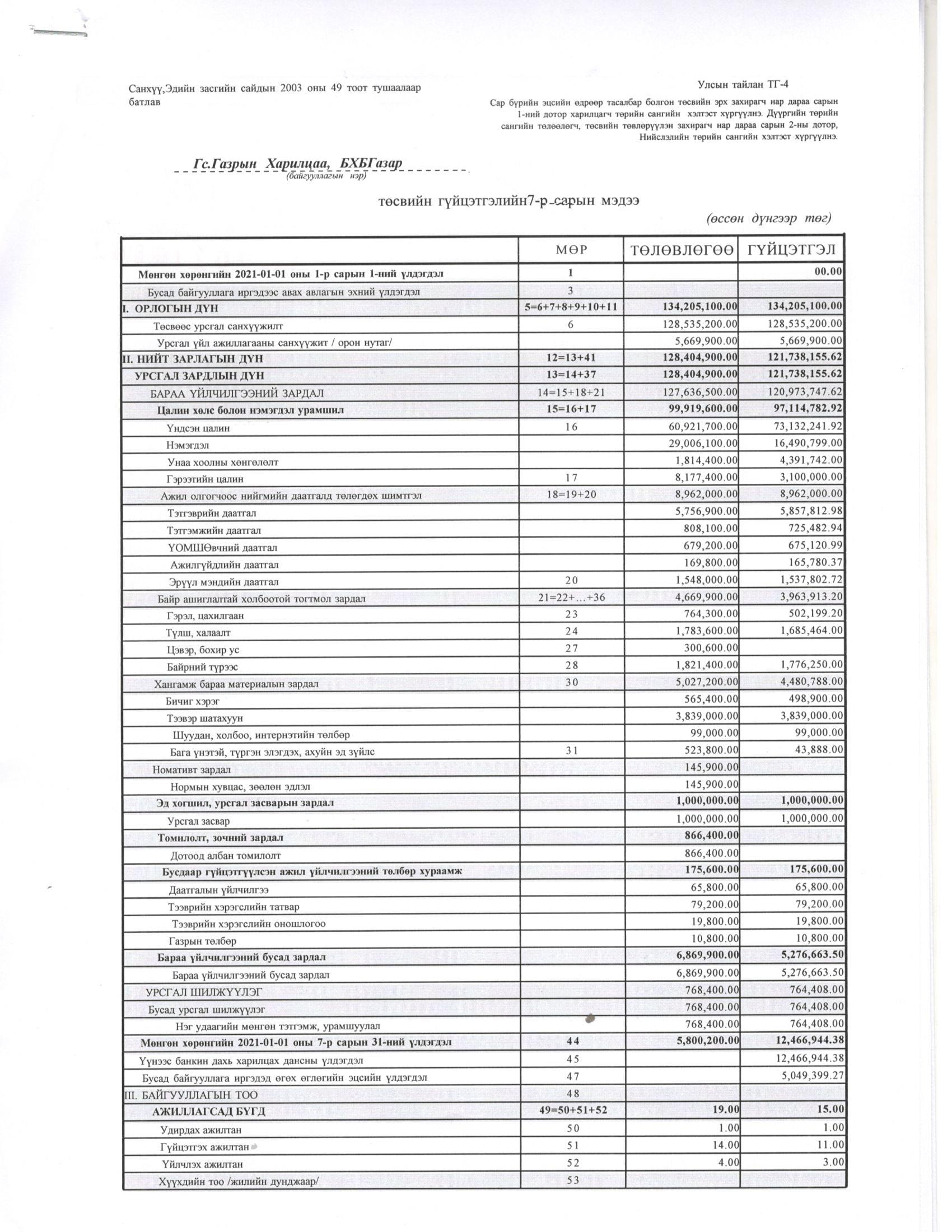 ТӨСВИЙН ГҮЙЦЭТГЭЛИЙН БИЕЛЭЛТ БОЛОН ХАГАС БҮТЭН ЖИЛИЙН САНХҮҮГИЙН ТАЙЛАН