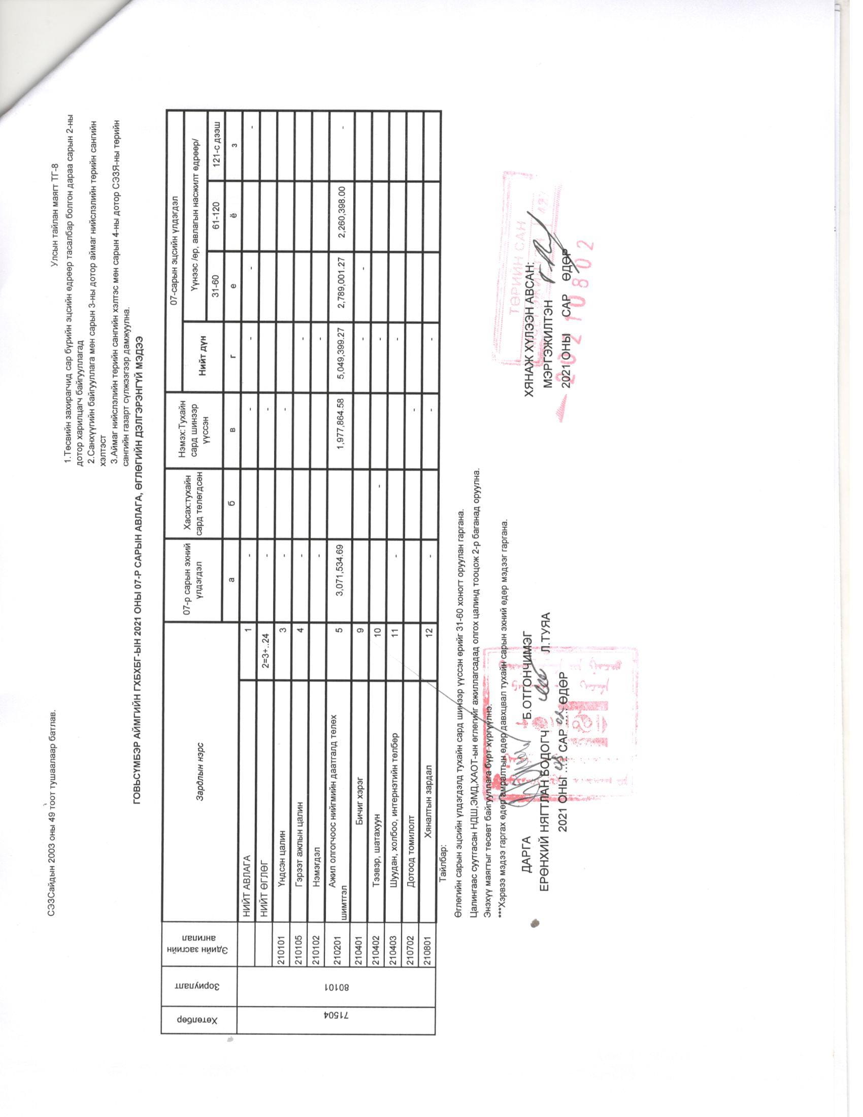 Төсвийн гүйцэтгэл 7 сар