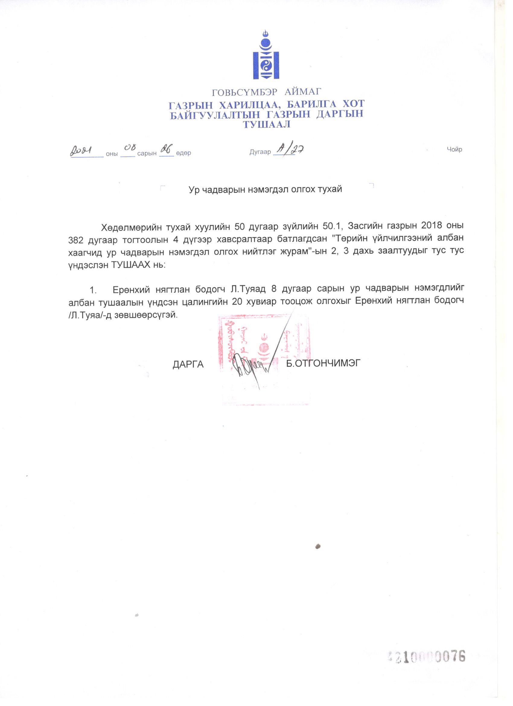 АЛБАН ХААГЧДИЙН АЖЛЫН ЧИГ ҮҮРЭГ, УТАСНЫ ДУГААР