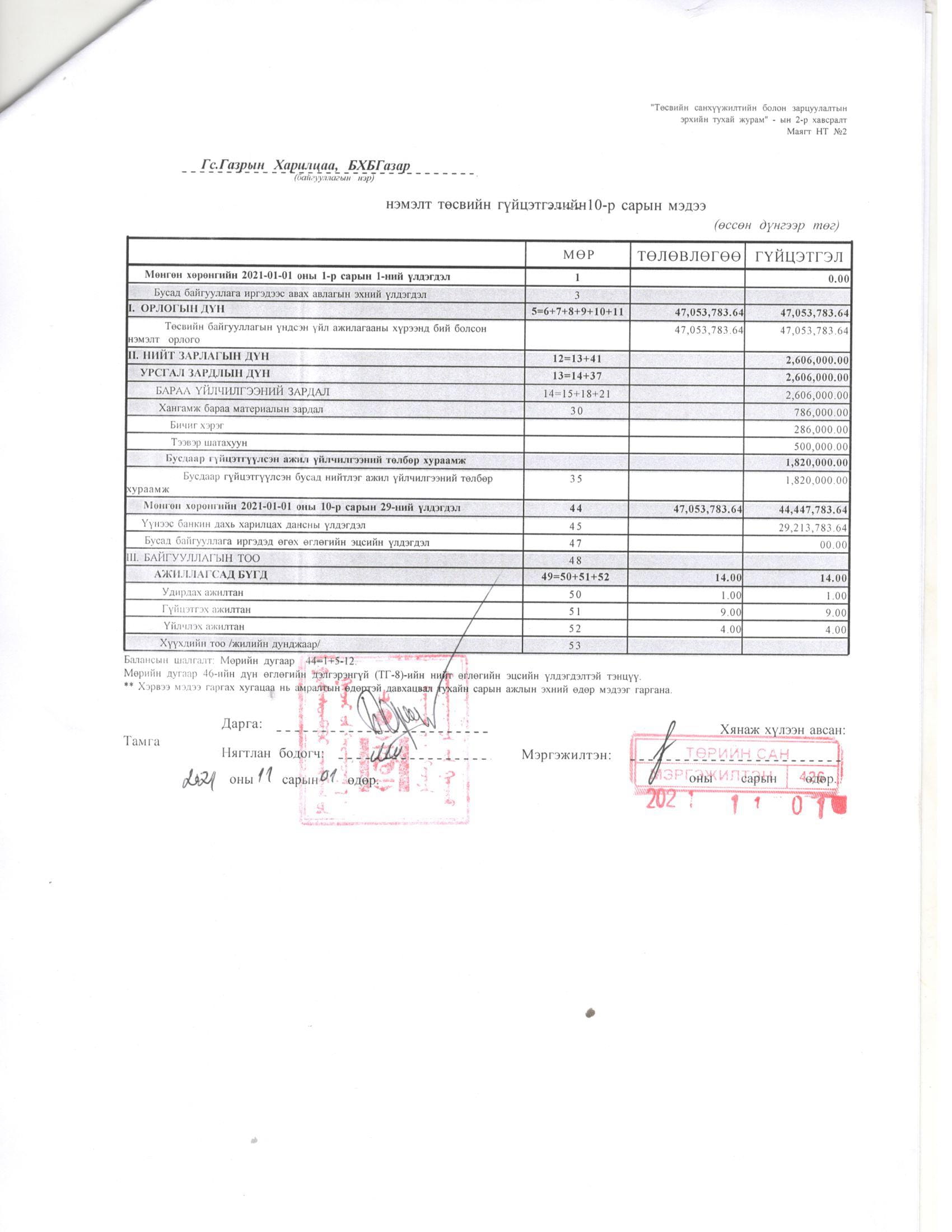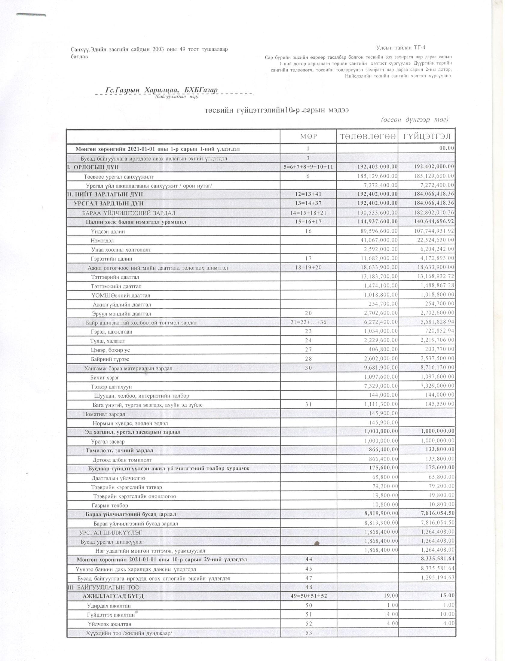 ТӨСВИЙН ГҮЙЦЭТГЭЛИЙН БИЕЛЭЛТ БОЛОН ХАГАС БҮТЭН ЖИЛИЙН САНХҮҮГИЙН ТАЙЛАН