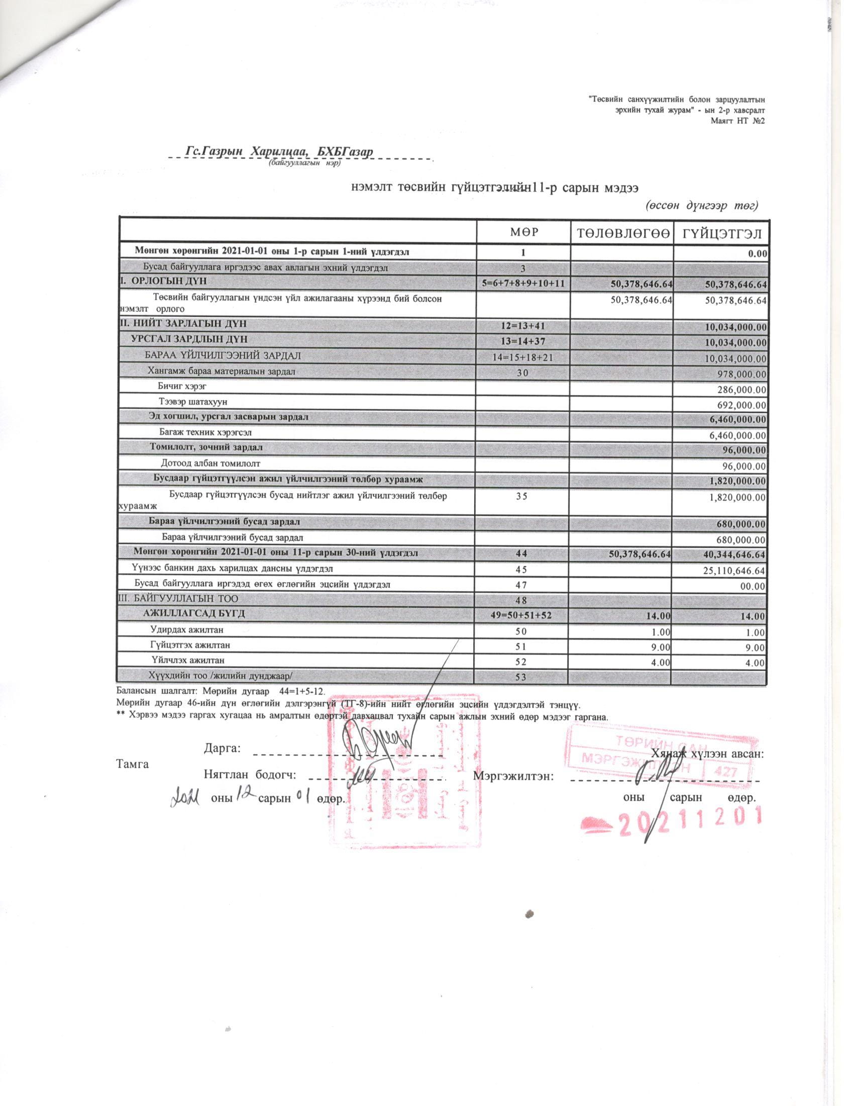 ТӨСВИЙН ГҮЙЦЭТГЭЛИЙН МЭДЭЭ