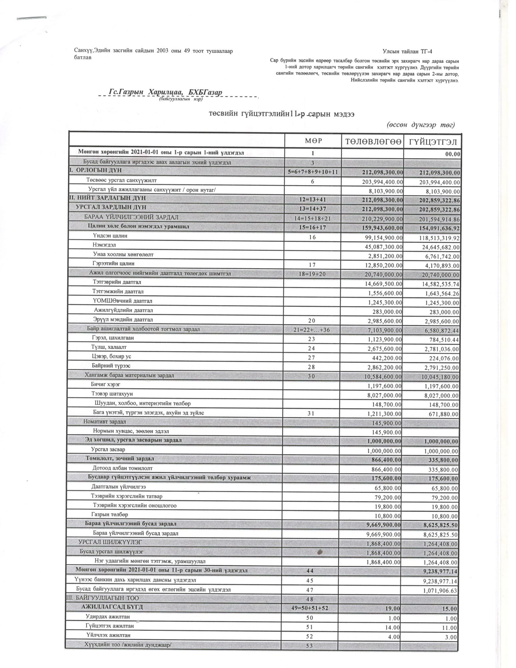 ТӨСВИЙН ГҮЙЦЭТГЭЛИЙН БИЕЛЭЛТ БОЛОН ХАГАС БҮТЭН ЖИЛИЙН САНХҮҮГИЙН ТАЙЛАН