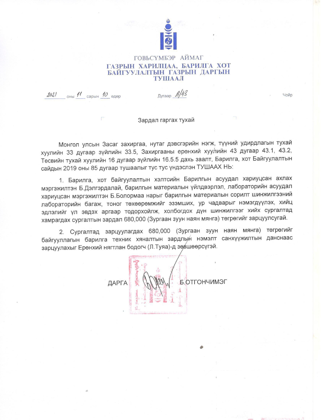 ДАРАА ОНЫ ТӨСВИЙН ТӨСӨЛ