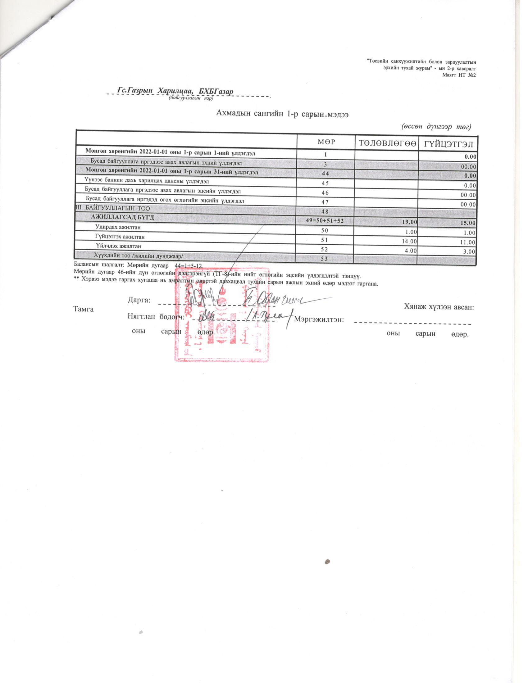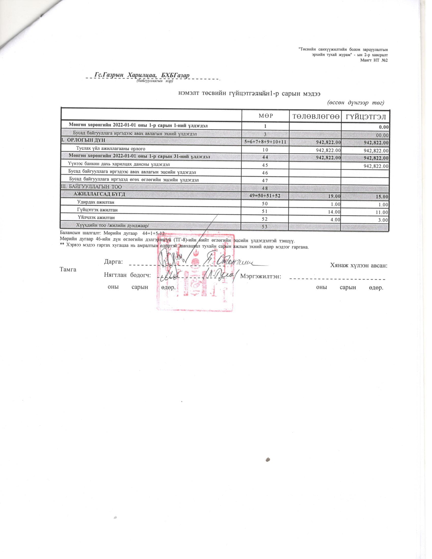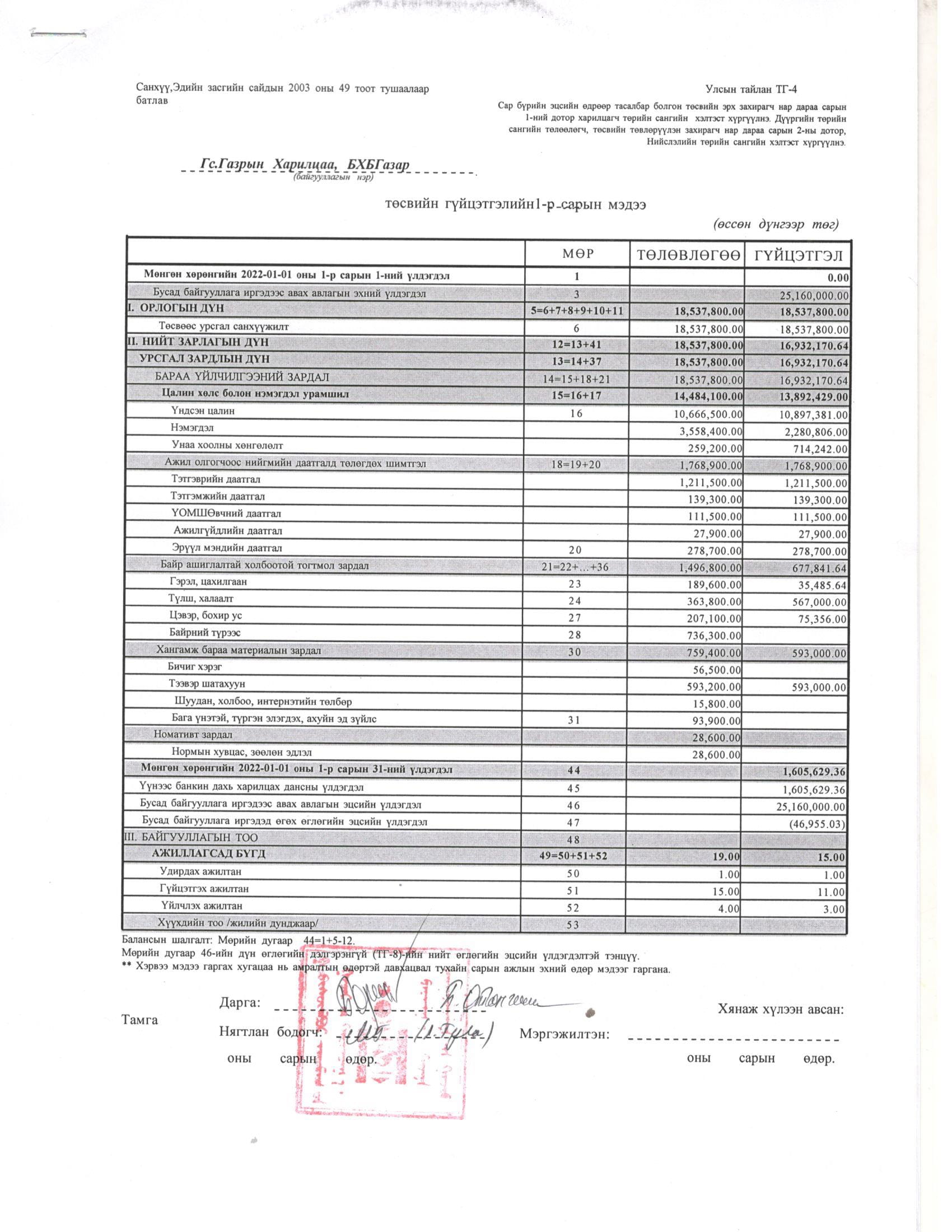 ТӨСВИЙН ГҮЙЦЭТГЭЛИЙН БИЕЛЭЛТ БОЛОН ХАГАС БҮТЭН ЖИЛИЙН САНХҮҮГИЙН ТАЙЛАН