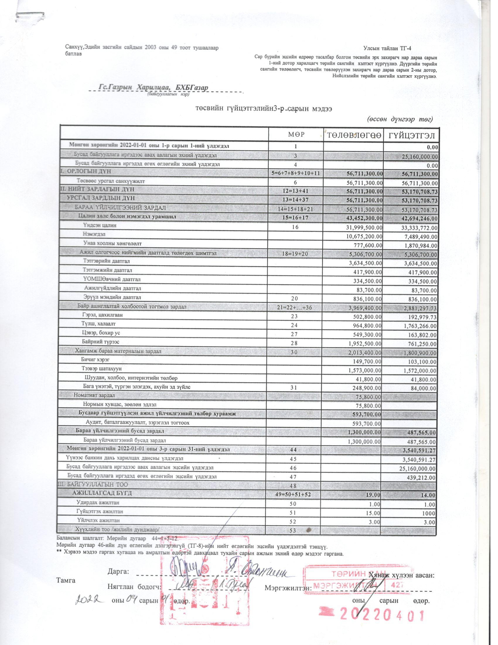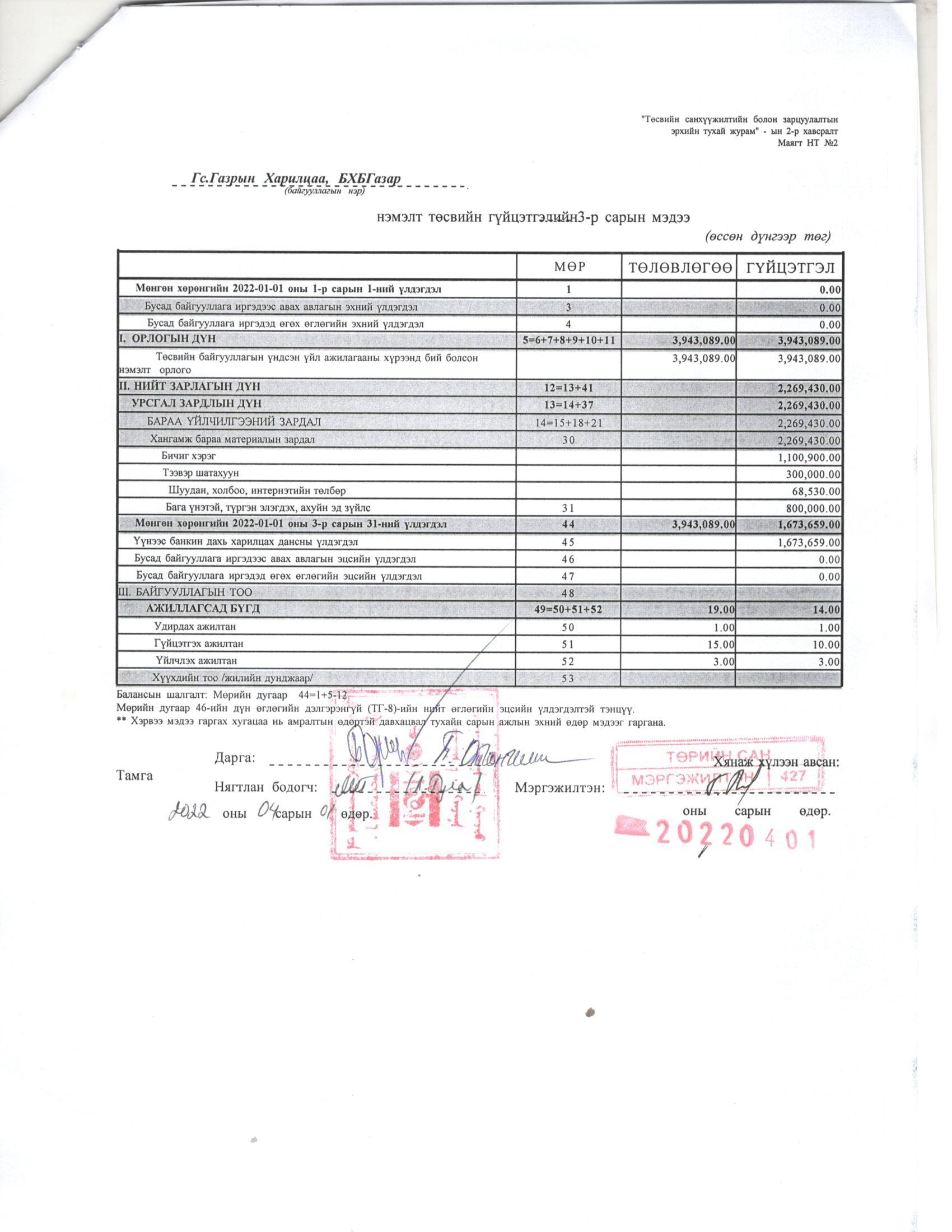 ТӨСВИЙН ГҮЙЦЭТГЭЛИЙН БИЕЛЭЛТ БОЛОН ХАГАС БҮТЭН ЖИЛИЙН САНХҮҮГИЙН ТАЙЛАН