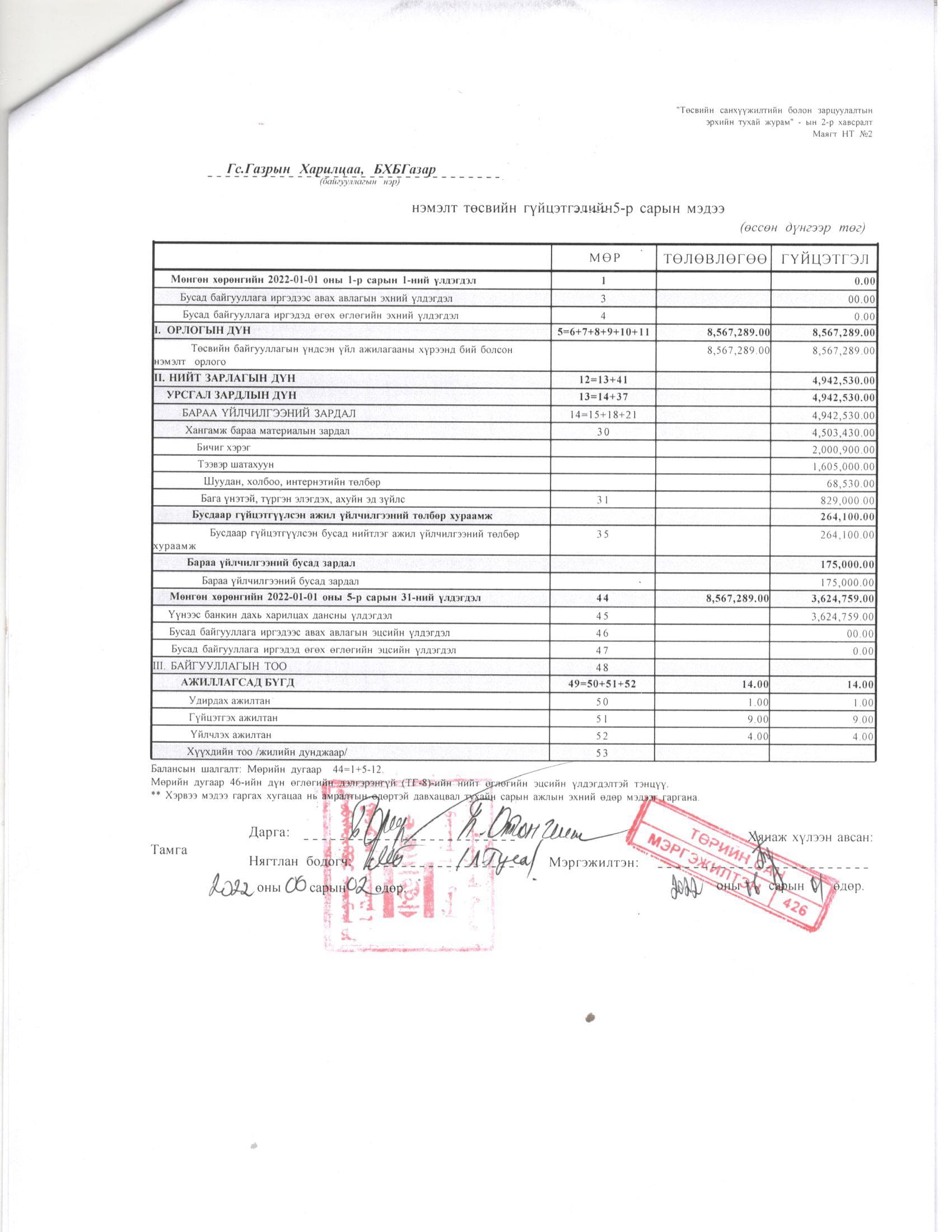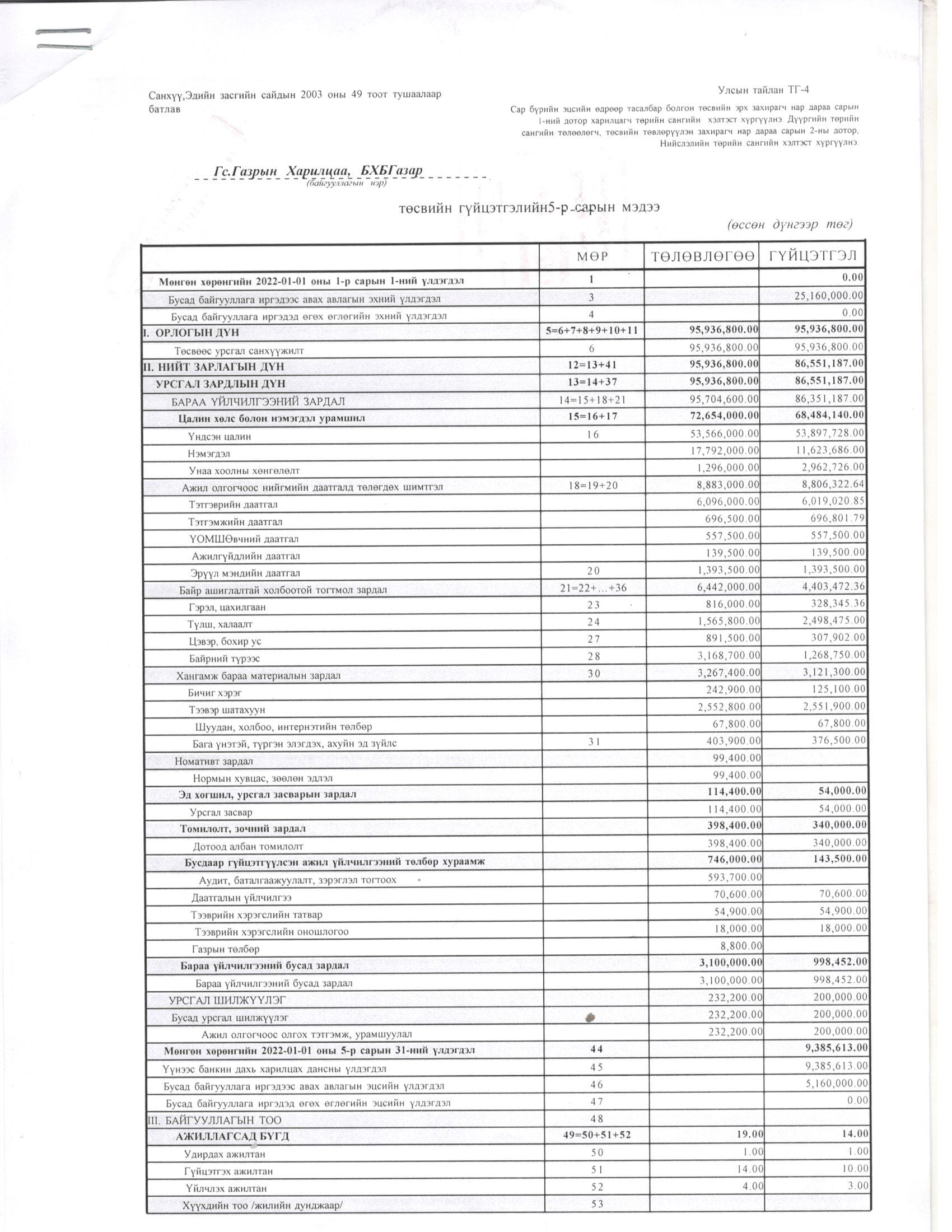 ТӨСВИЙН ГҮЙЦЭТГЭЛИЙН БИЕЛЭЛТ БОЛОН ХАГАС БҮТЭН ЖИЛИЙН САНХҮҮГИЙН ТАЙЛАН