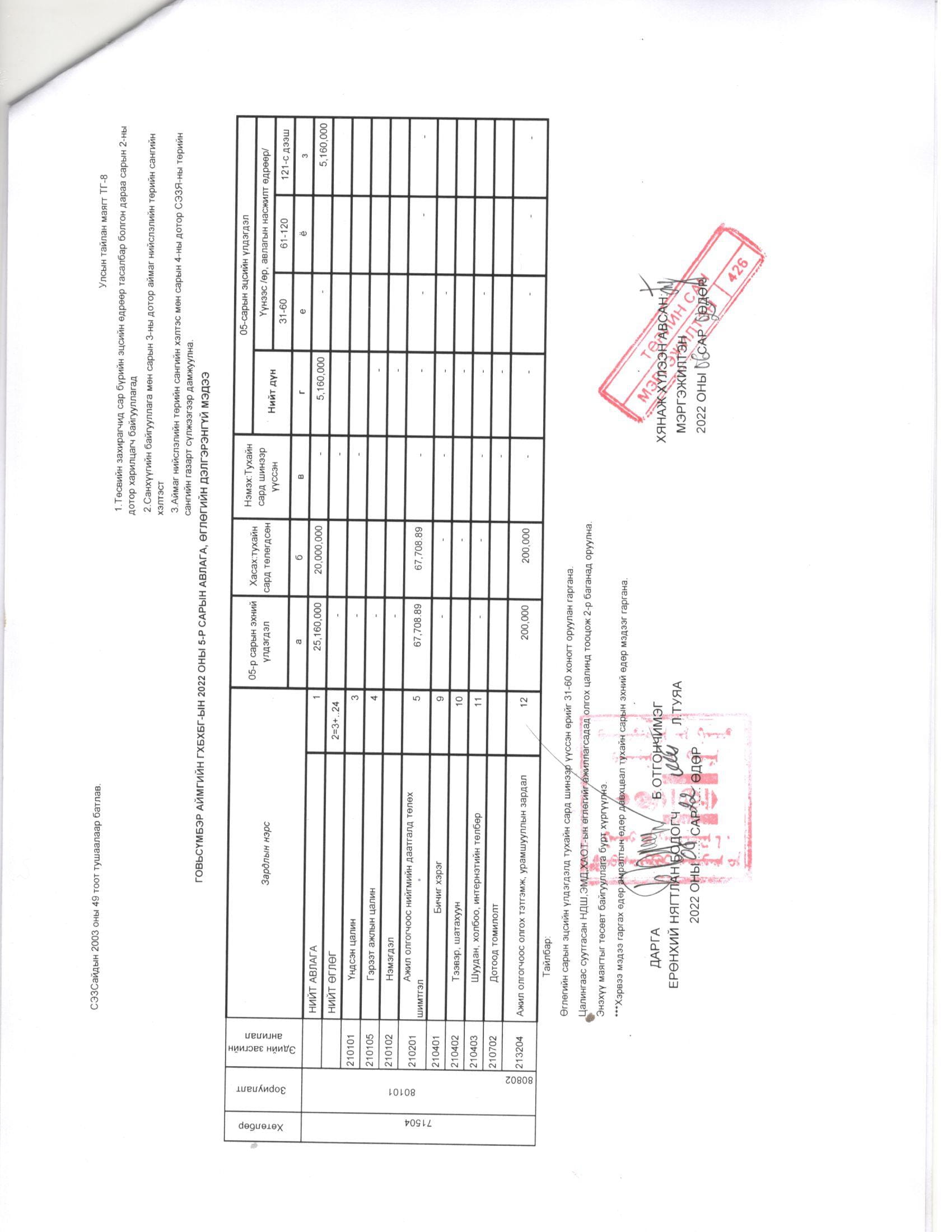 Төсвийн гүйцэтгэл 5 сар