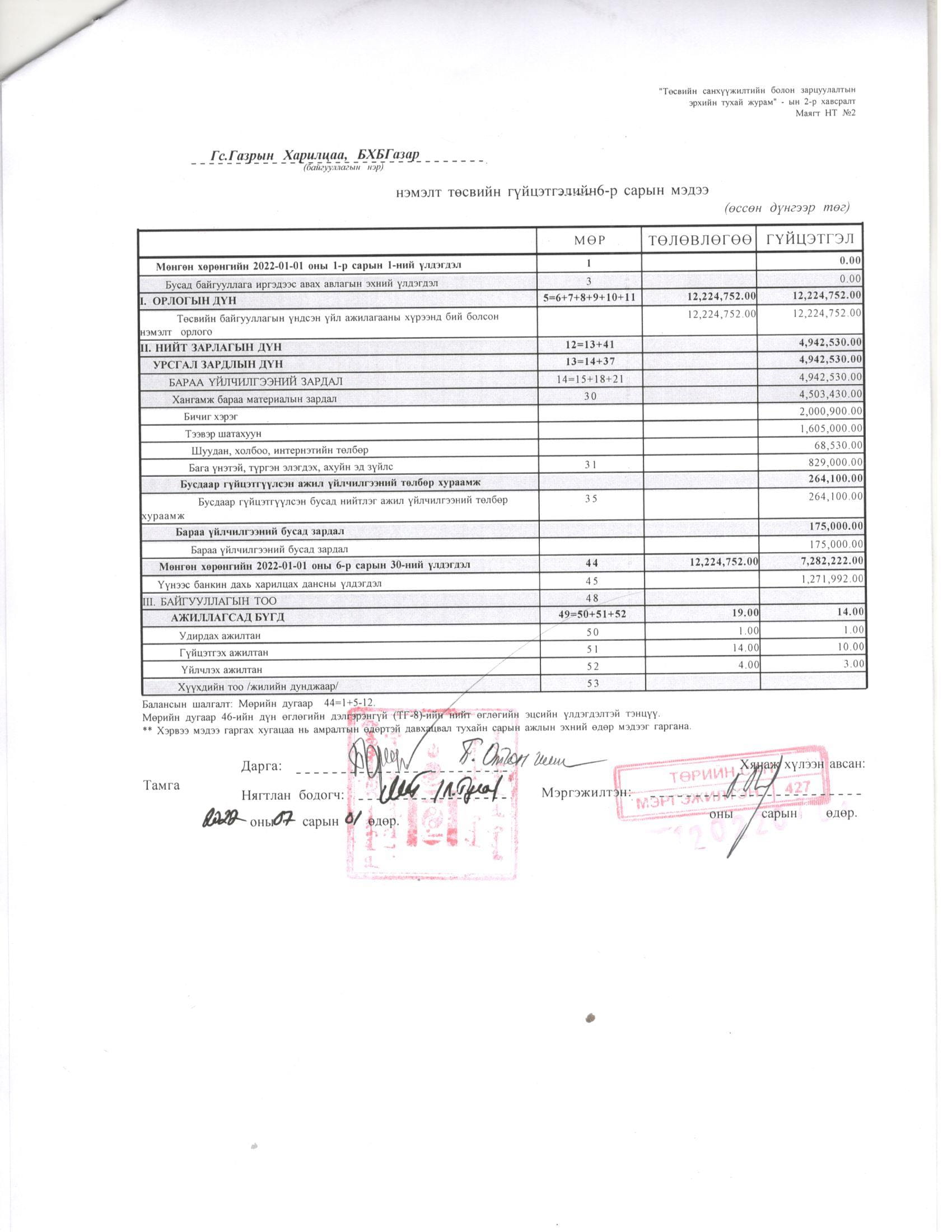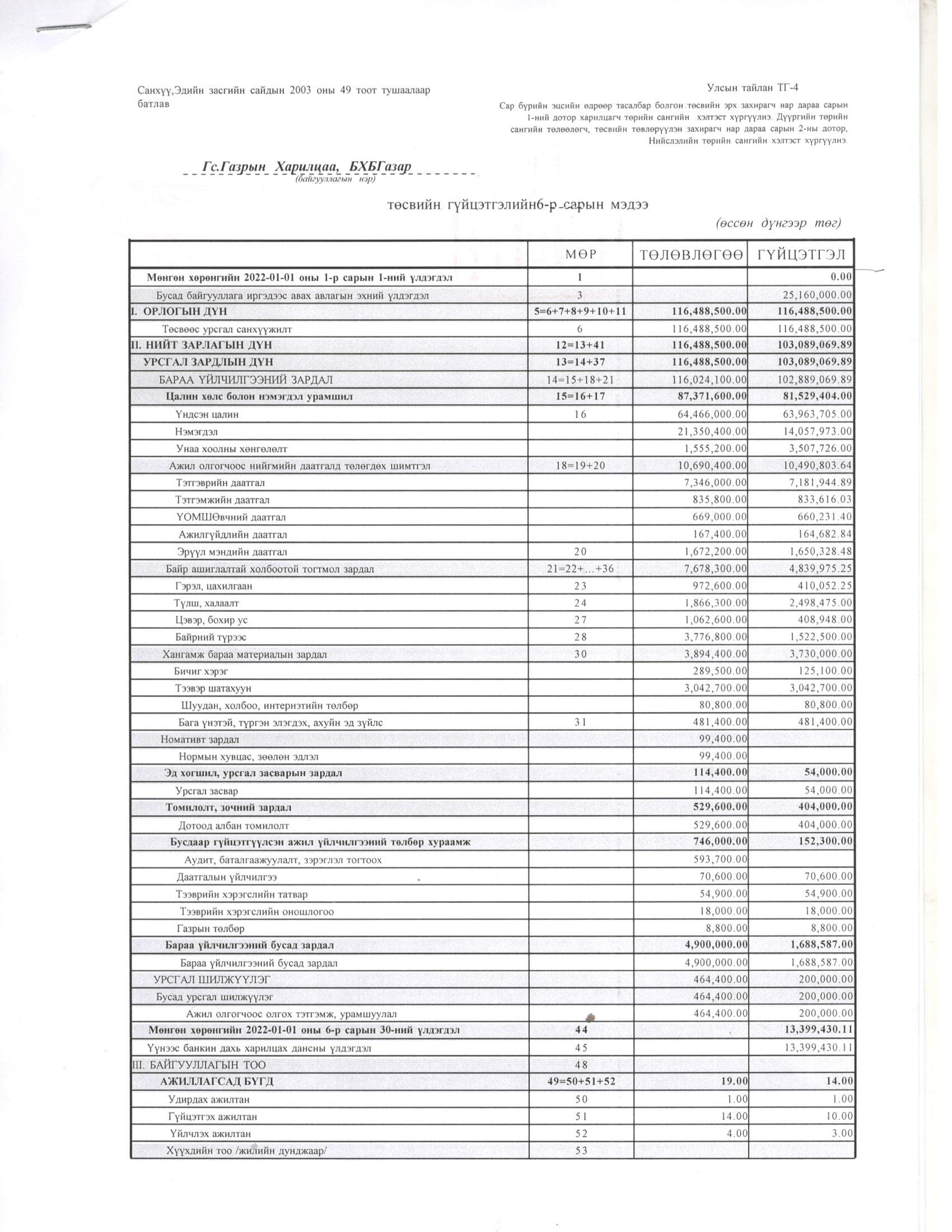 ТӨСВИЙН ГҮЙЦЭТГЭЛИЙН БИЕЛЭЛТ БОЛОН ХАГАС БҮТЭН ЖИЛИЙН САНХҮҮГИЙН ТАЙЛАН
