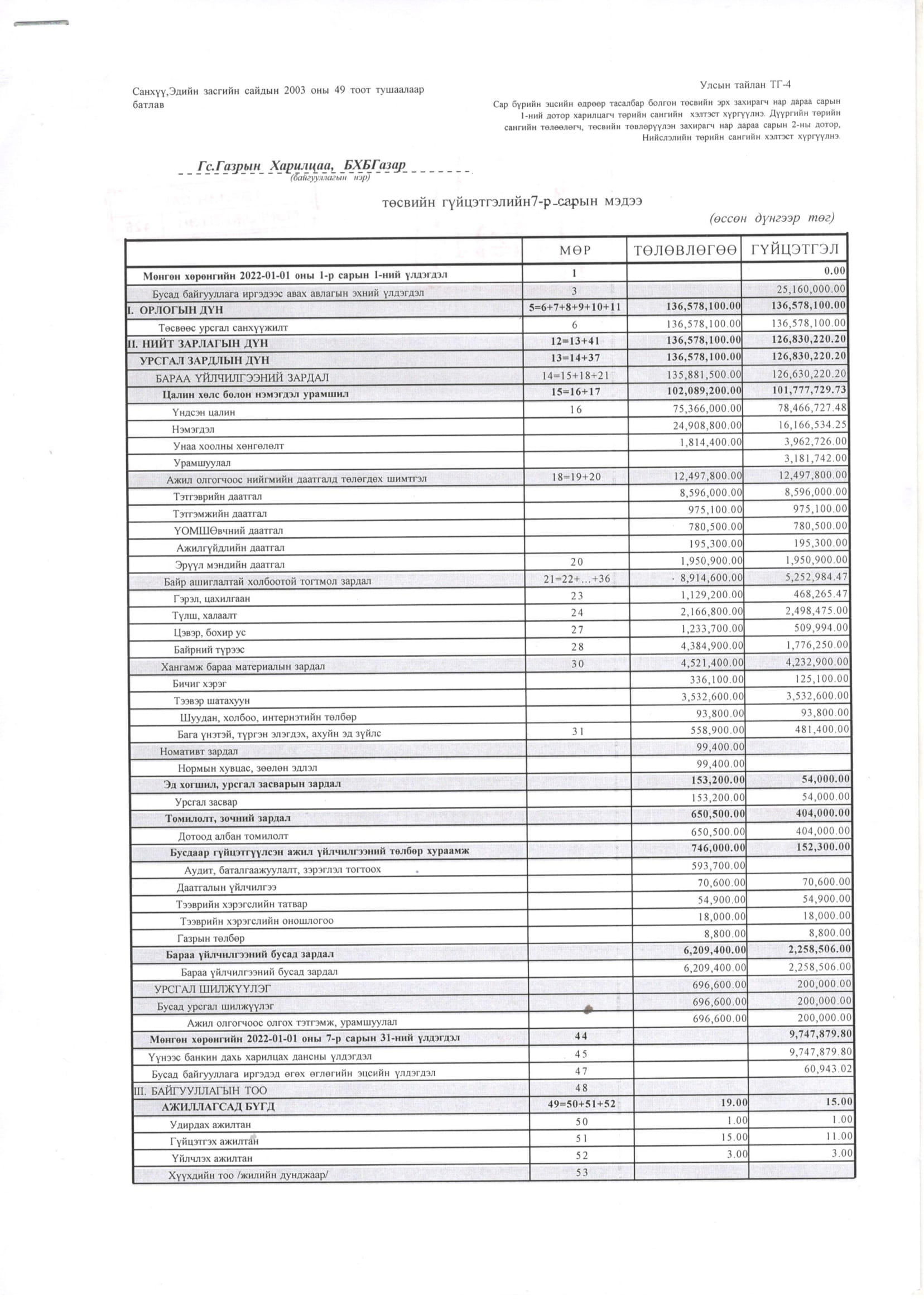 ТӨСВИЙН ГҮЙЦЭТГЭЛИЙН БИЕЛЭЛТ БОЛОН ХАГАС БҮТЭН ЖИЛИЙН САНХҮҮГИЙН ТАЙЛАН