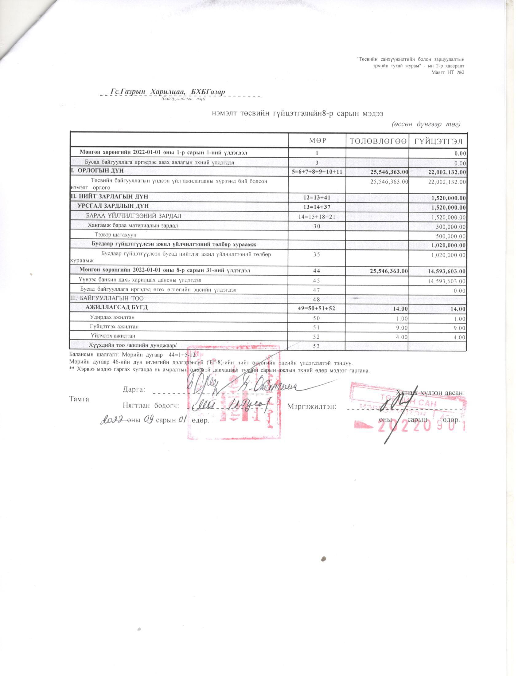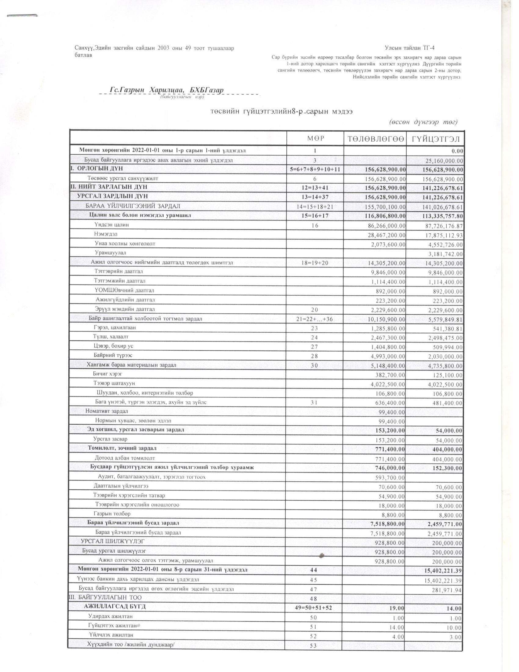 ТӨСВИЙН ГҮЙЦЭТГЭЛИЙН БИЕЛЭЛТ БОЛОН ХАГАС БҮТЭН ЖИЛИЙН САНХҮҮГИЙН ТАЙЛАН