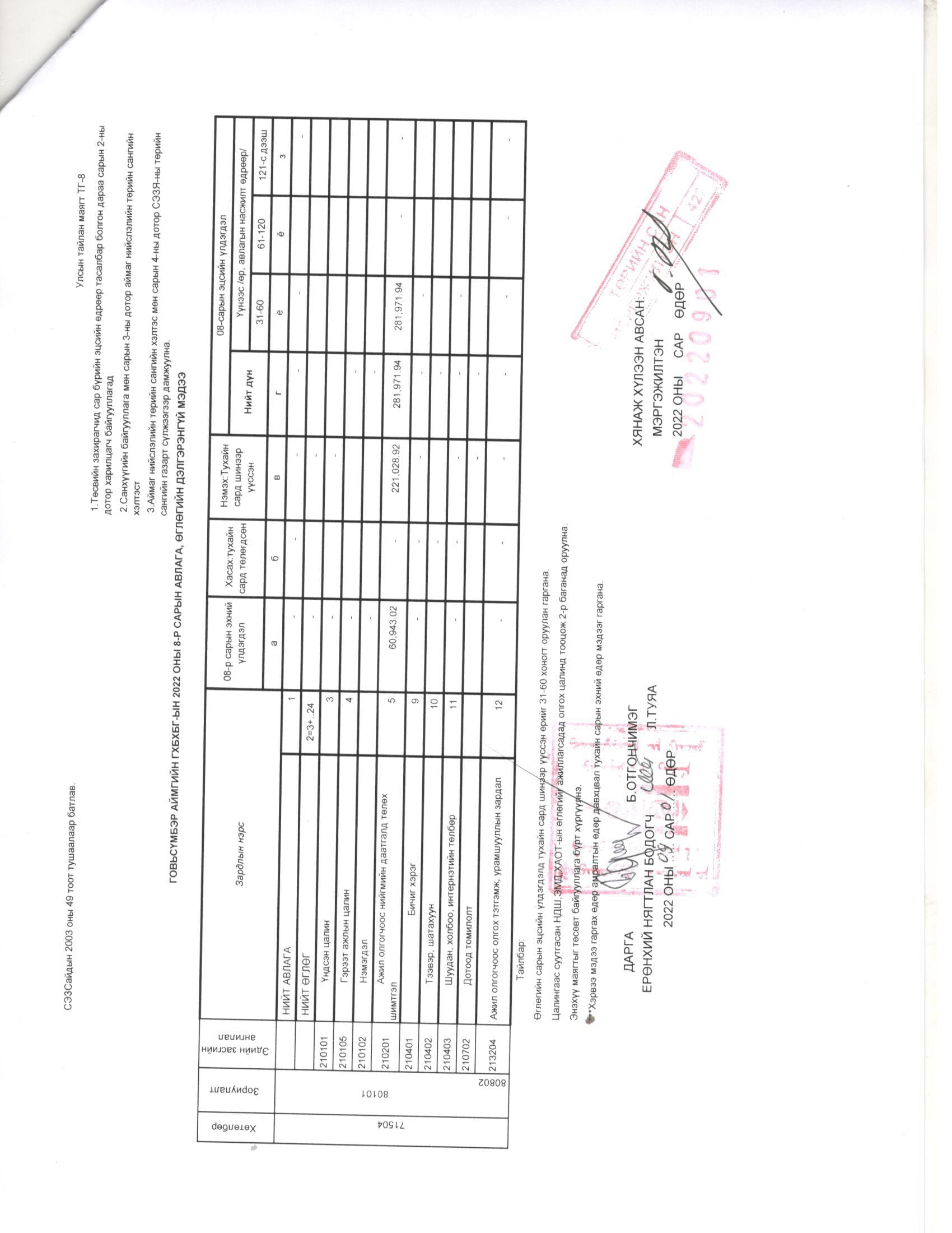 Төсвийн гүйцэтгэл 8 сар