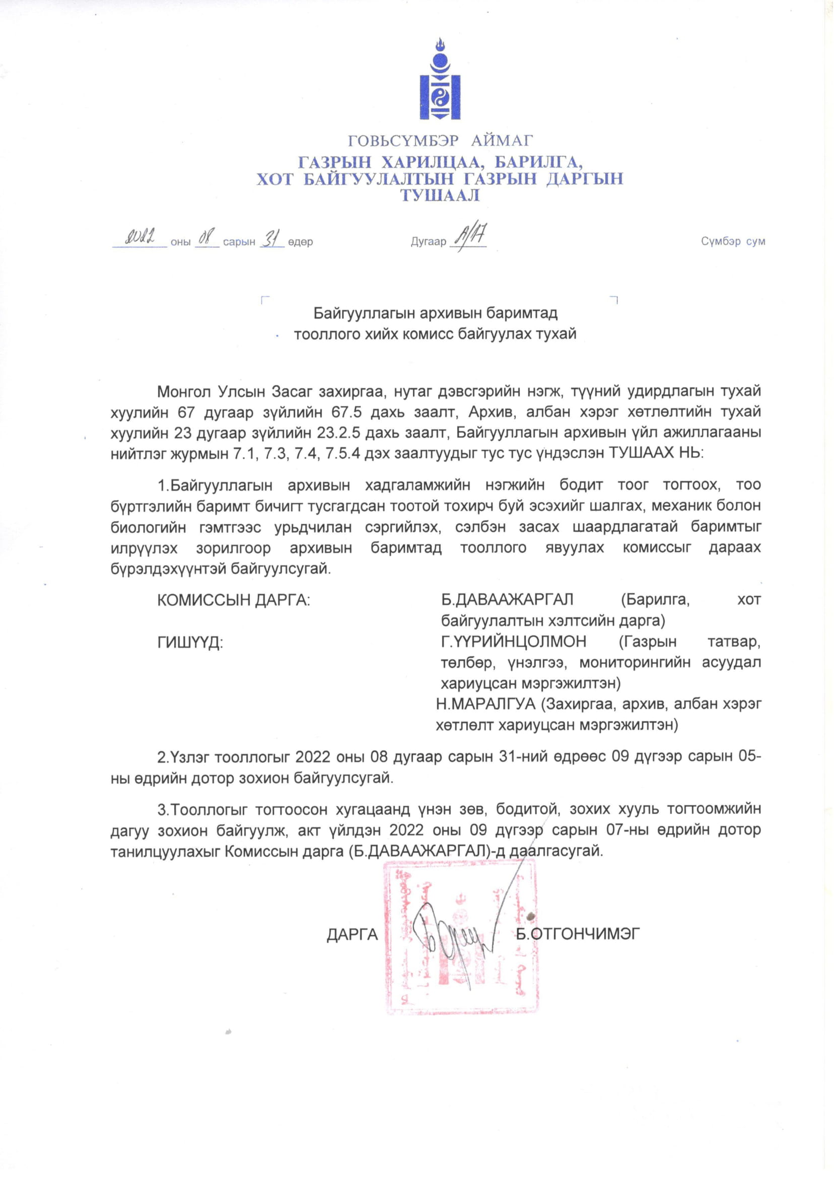 Байгууллагын архивын баримтад тооллого хийх комисс байгуулах тухай А/17