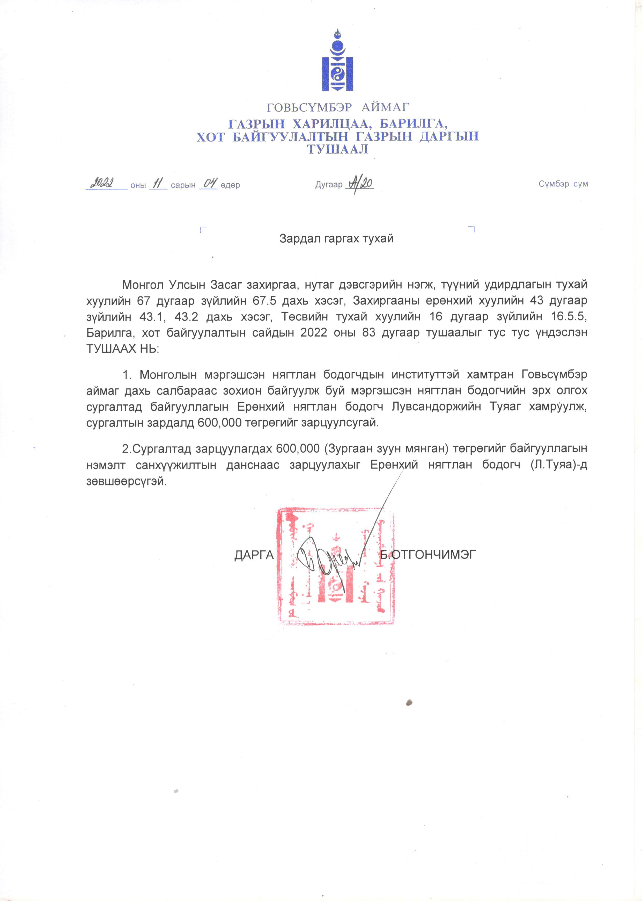 Зардал гаргах тухай А/20