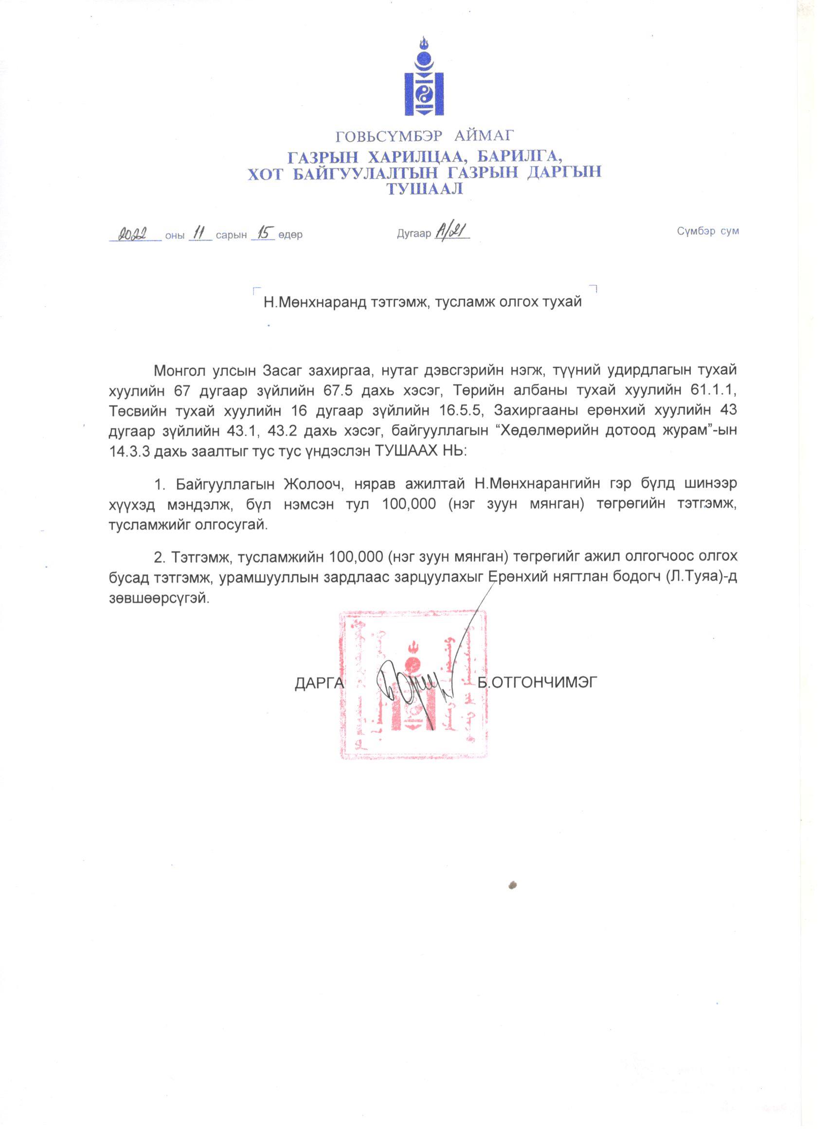 Н.Мөнхнаранд тэтгэмж, тусламж олгох тухай А/21