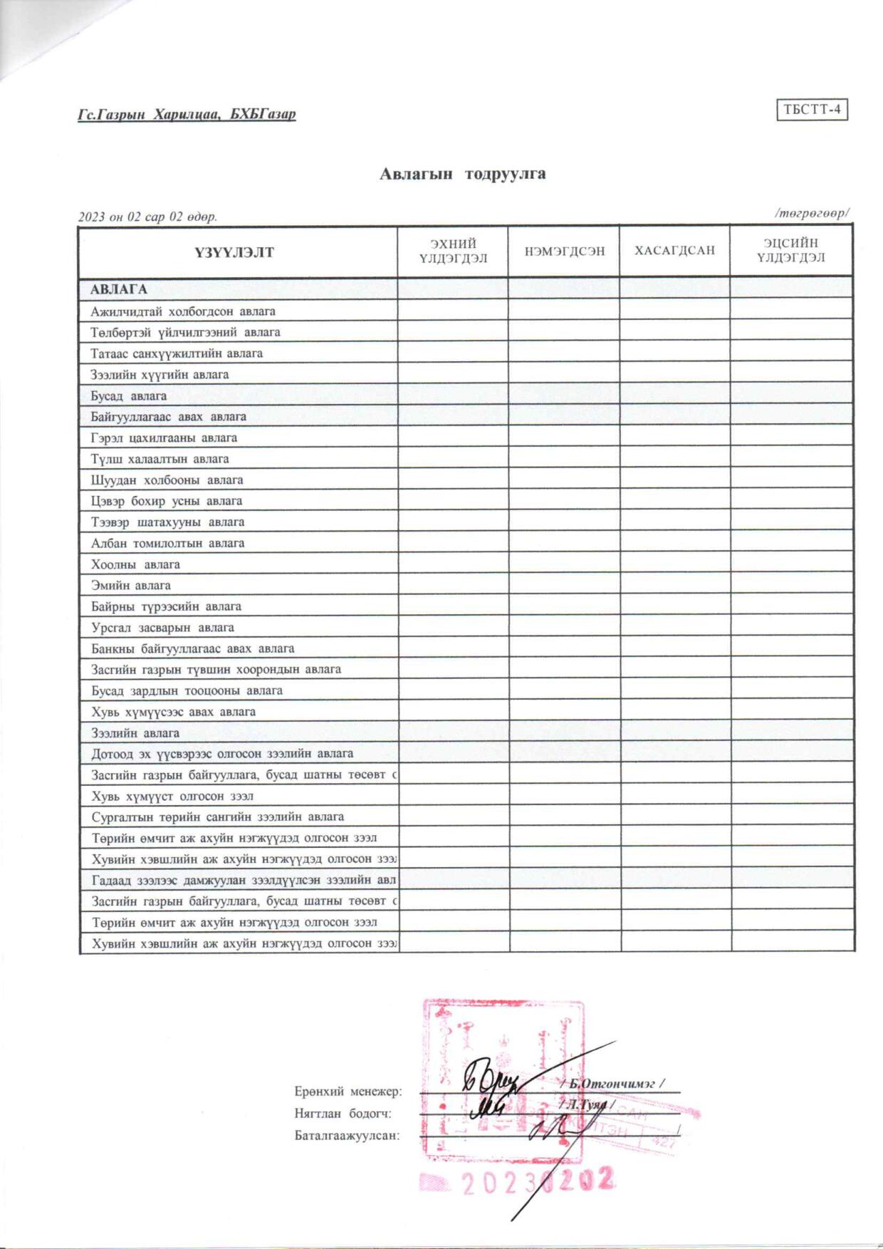 САНХҮҮГИЙН ХЯНАЛТ ШАЛГАЛТЫН ТАЙЛАН, АКТ, ДҮГНЭЛТ АЛБАН ШААРДЛАГА ЗӨВЛӨМЖ